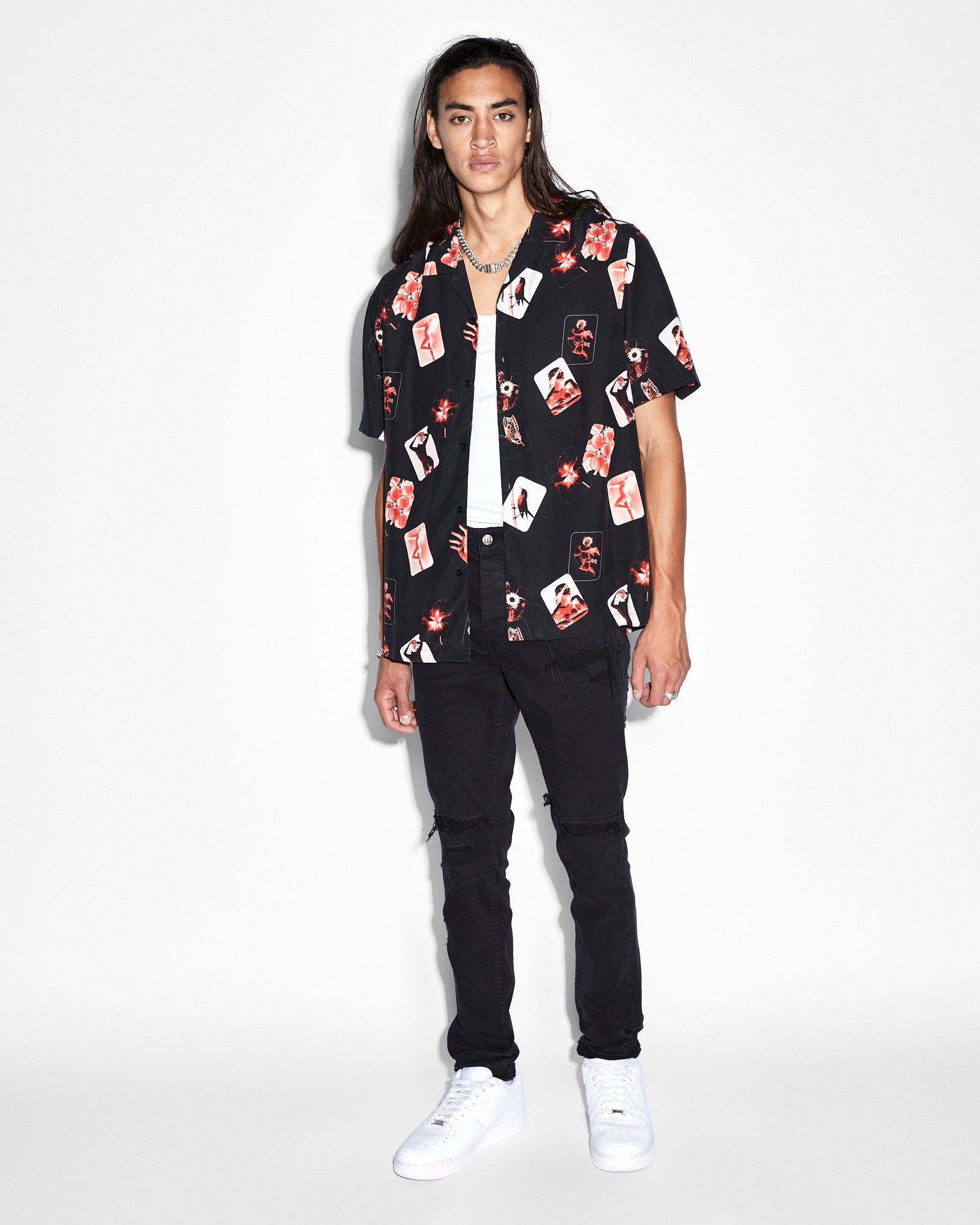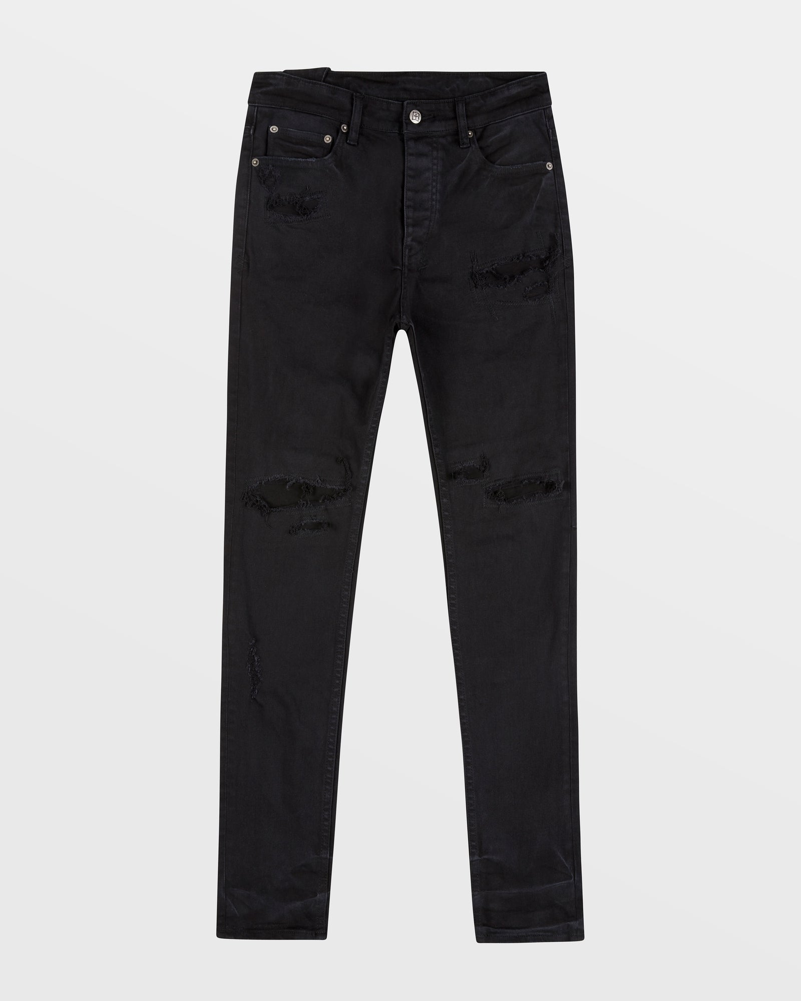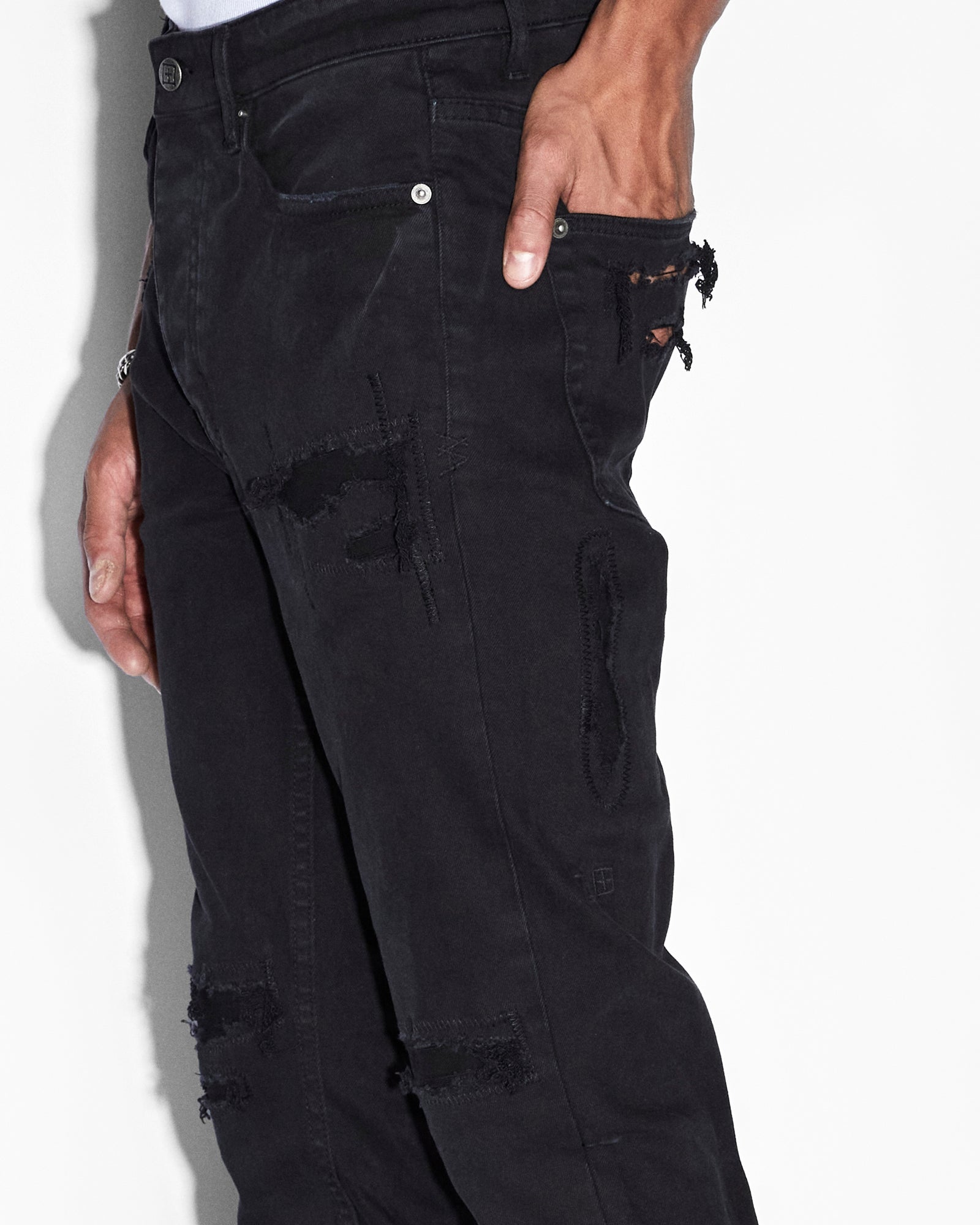 The Chitch Refurb features rip and repair construction details on the front and back, five pockets and a button fly. This slim tapered jean is a mid rise with a signature dutch tab and is made from premium washed black comfort stretch denim. Finished with signature t-box, woven pocket tag, 4x4 embroidery and Ksubi branded hardware.