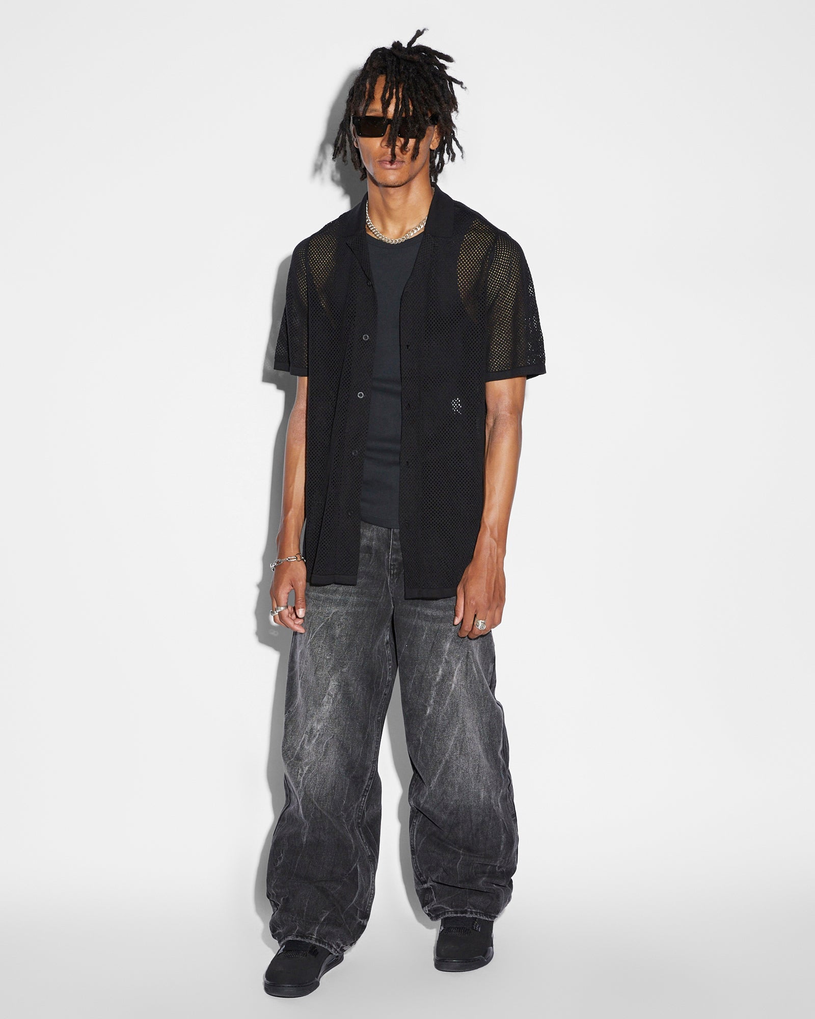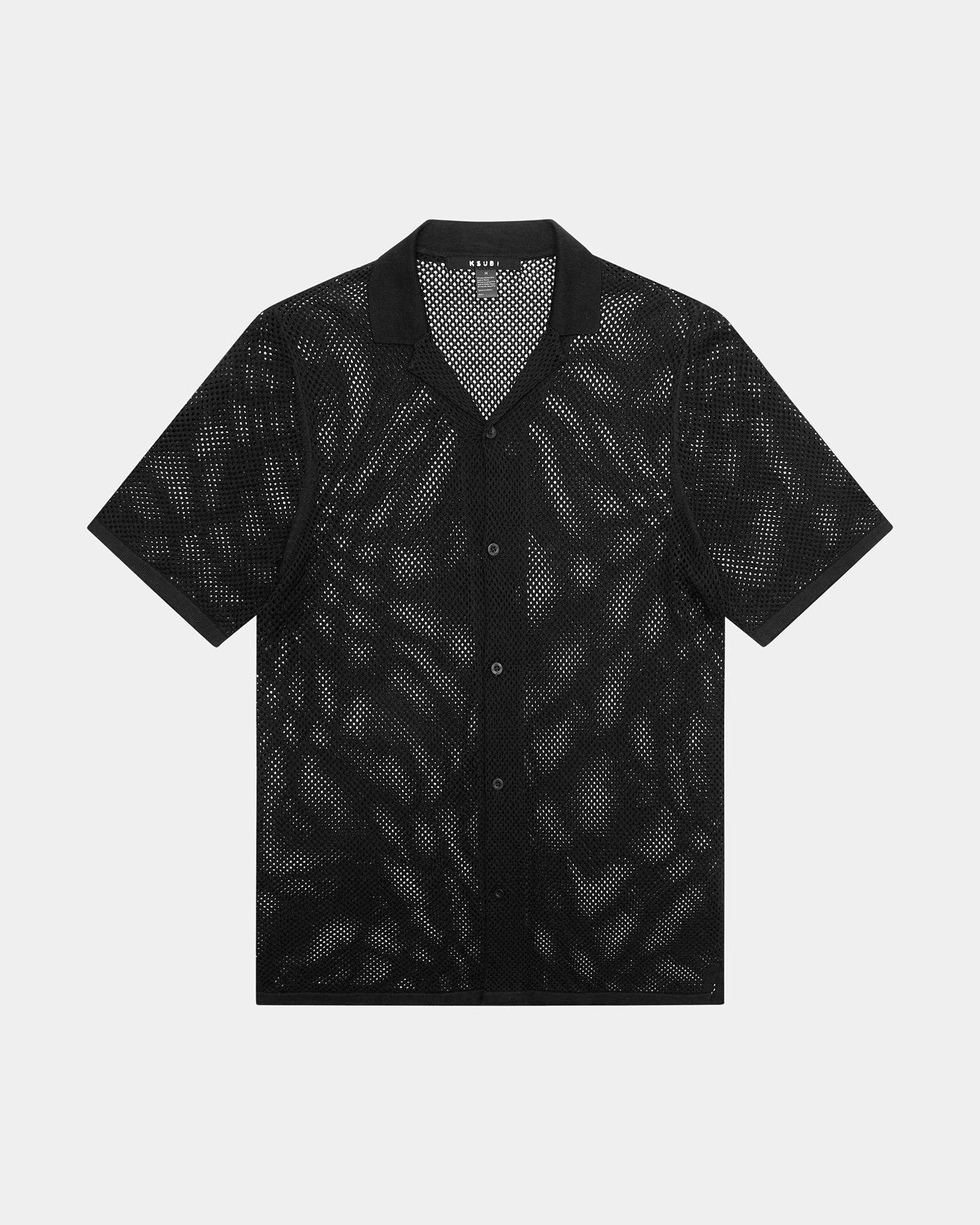 The Net Worth Knit Resort Ss Shirt Black is a mesh style resort shirt knitted from a 100% cotton black yarn in an open loop pattern. This shirt is finished with a signature sleeve tag and Ksubi branded hardware.