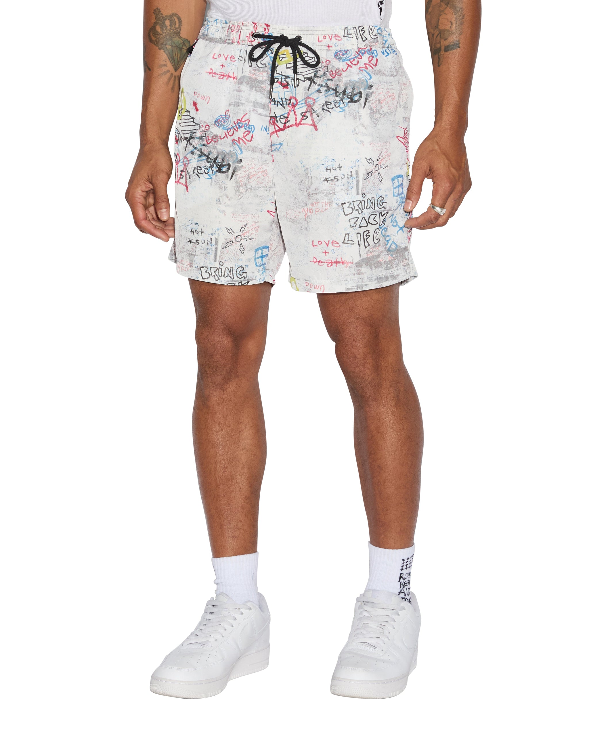 The Skrawler Boardshort White is a regular fitting short made from a water resistant fabric with an all over graffiti print. Features branded metal trims, a t-box charm, elastic waistband and drawstring.