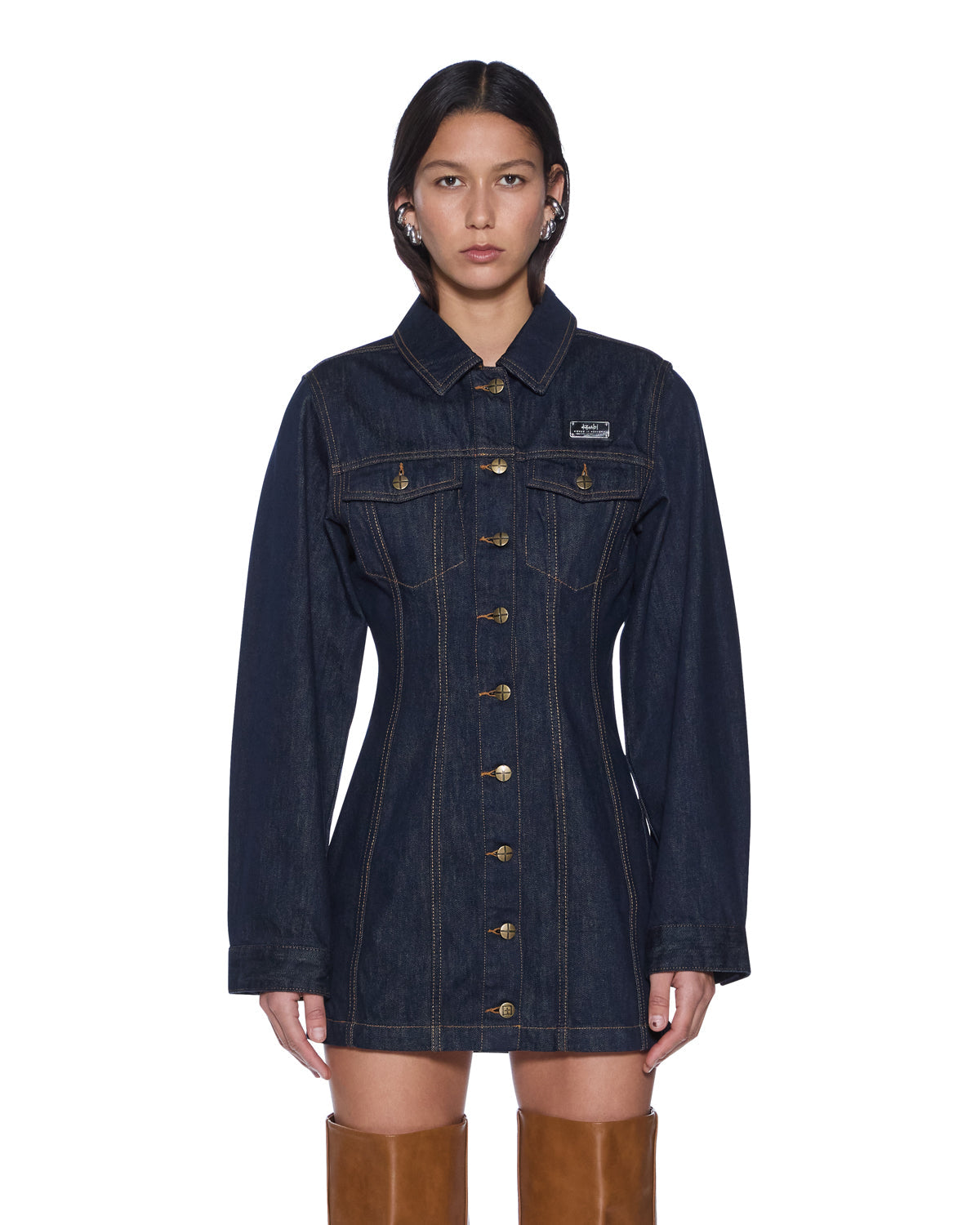 The Contour Dress Original is a fashion-forward mini dress with curved trucker panel lines that create an hourglass silhouette. Crafted from premium rigid raw rinse denim with tobacco topstitching, it features a mini length, dropped shoulders, wide sleeves, a center front shank closure, anti-brass hardware, and a luxe Ksubi metal plate for an elevated finish.