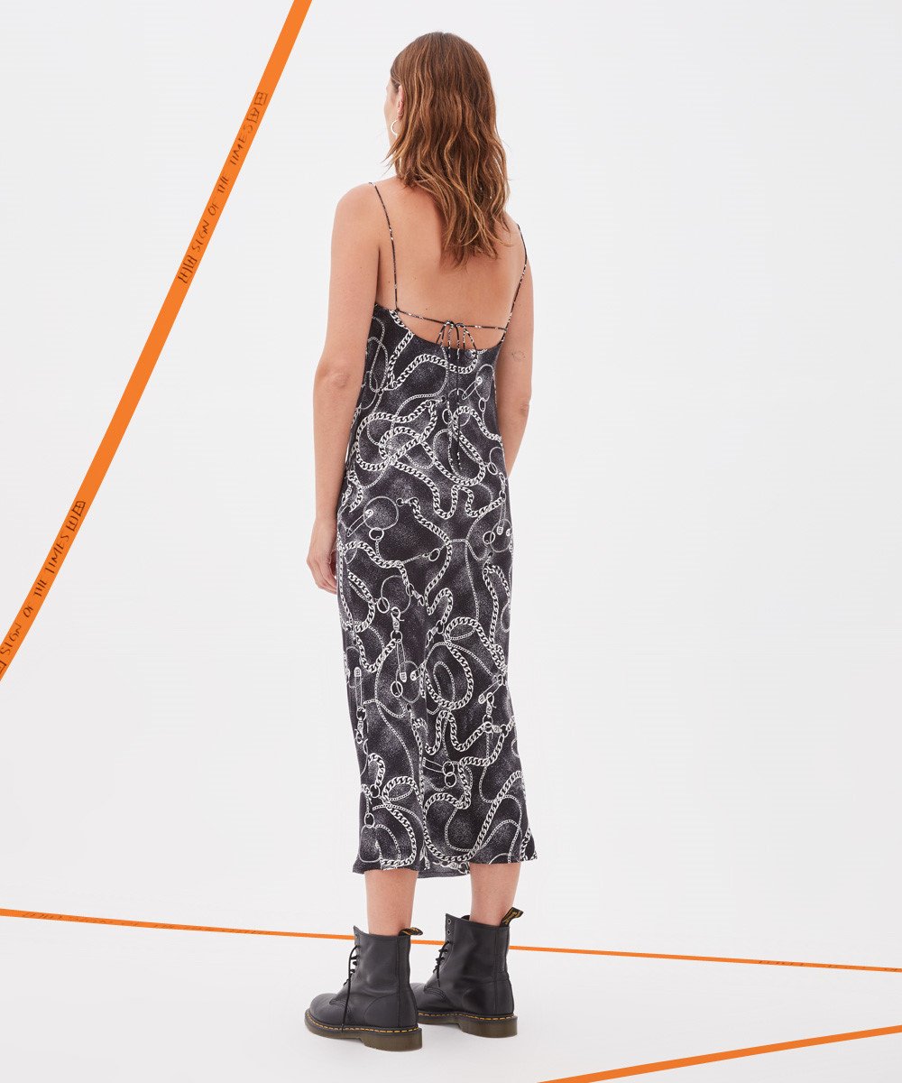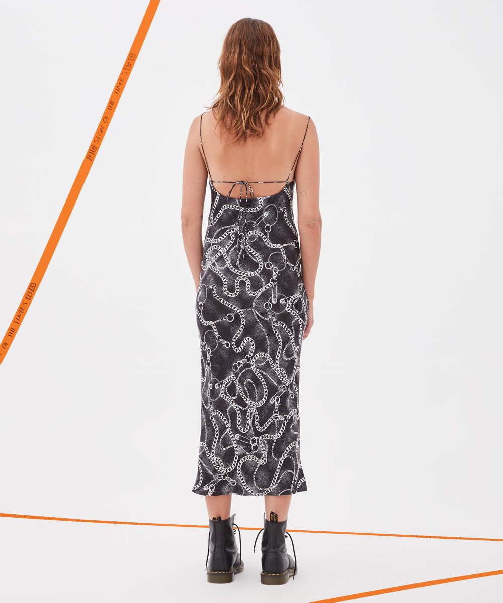 Bias cut dress with all over heavy metal yardage print and roulette loop ties at back closure.