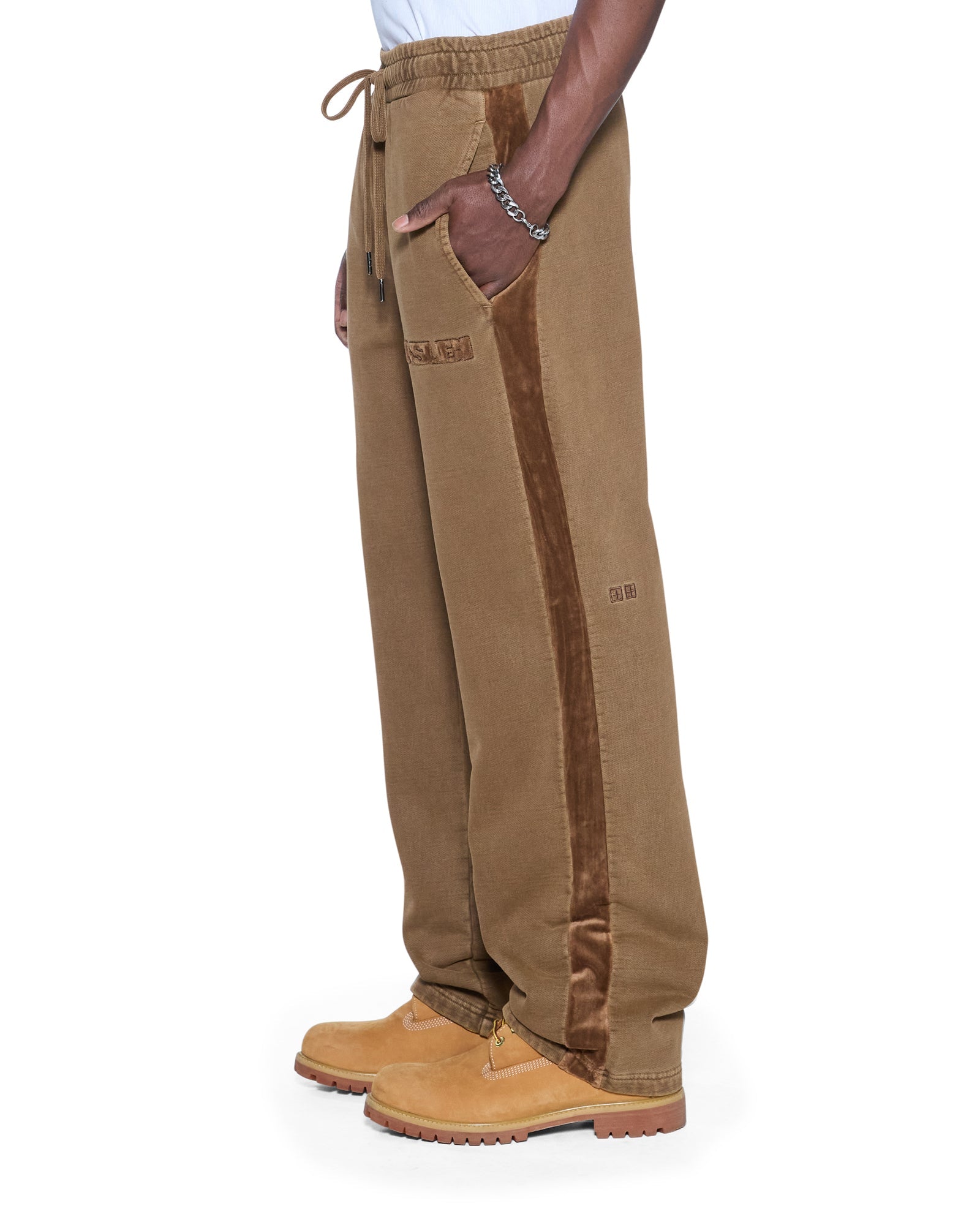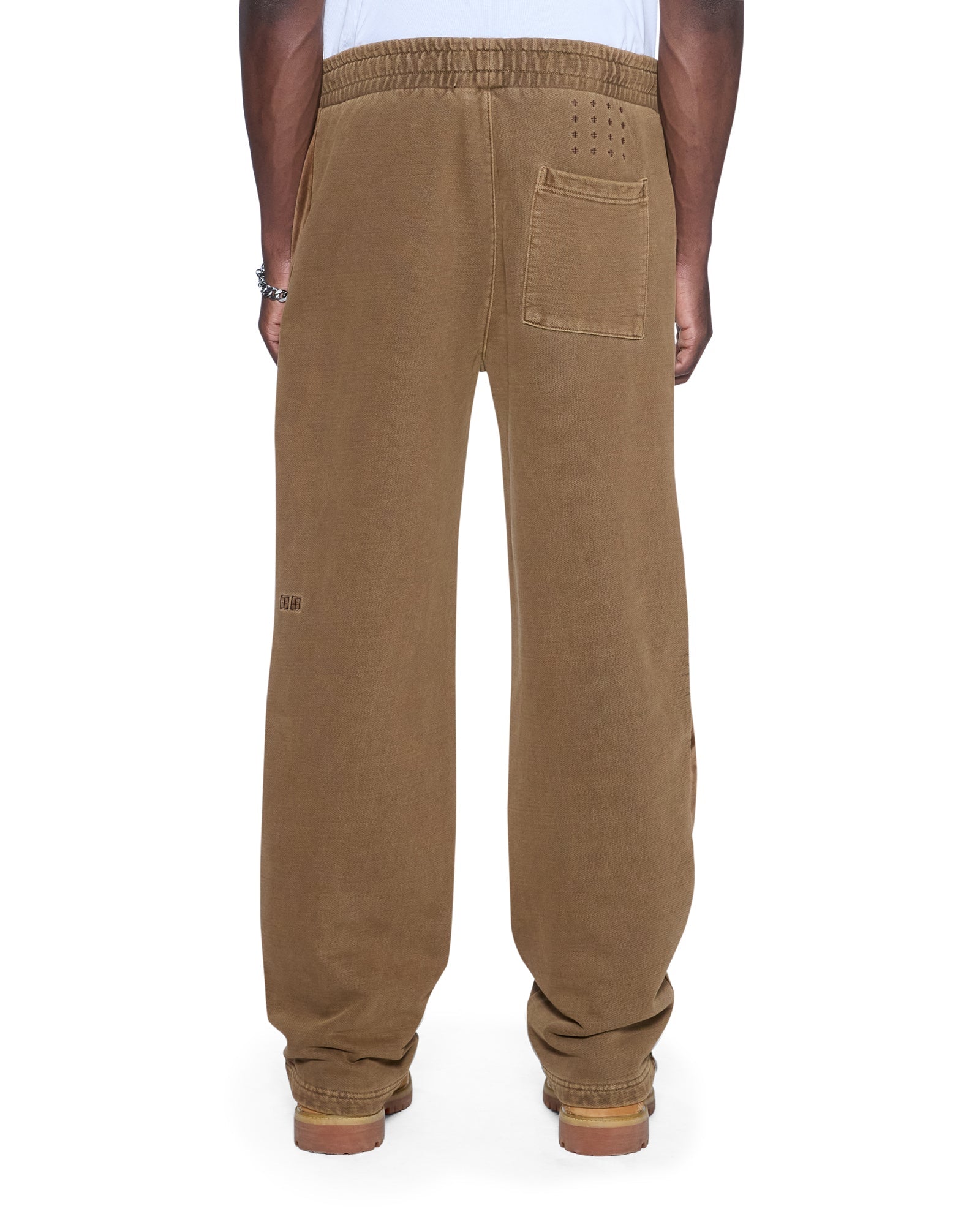 The 4X4 Luxe Trak Pant Espresso brown is a mid-rise, straight leg track pant with an elasticated waistband and drawcord for all-day comfort. Crafted from premium loopback fleece in a brown colourway, it features flocked side seam panels with saddle stitching, a Sign of the Times applique logo, and is finished with signature T-box and 4x4 embroidery branding.
