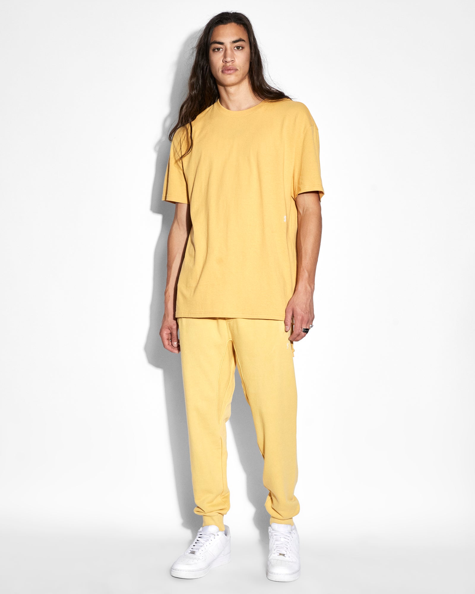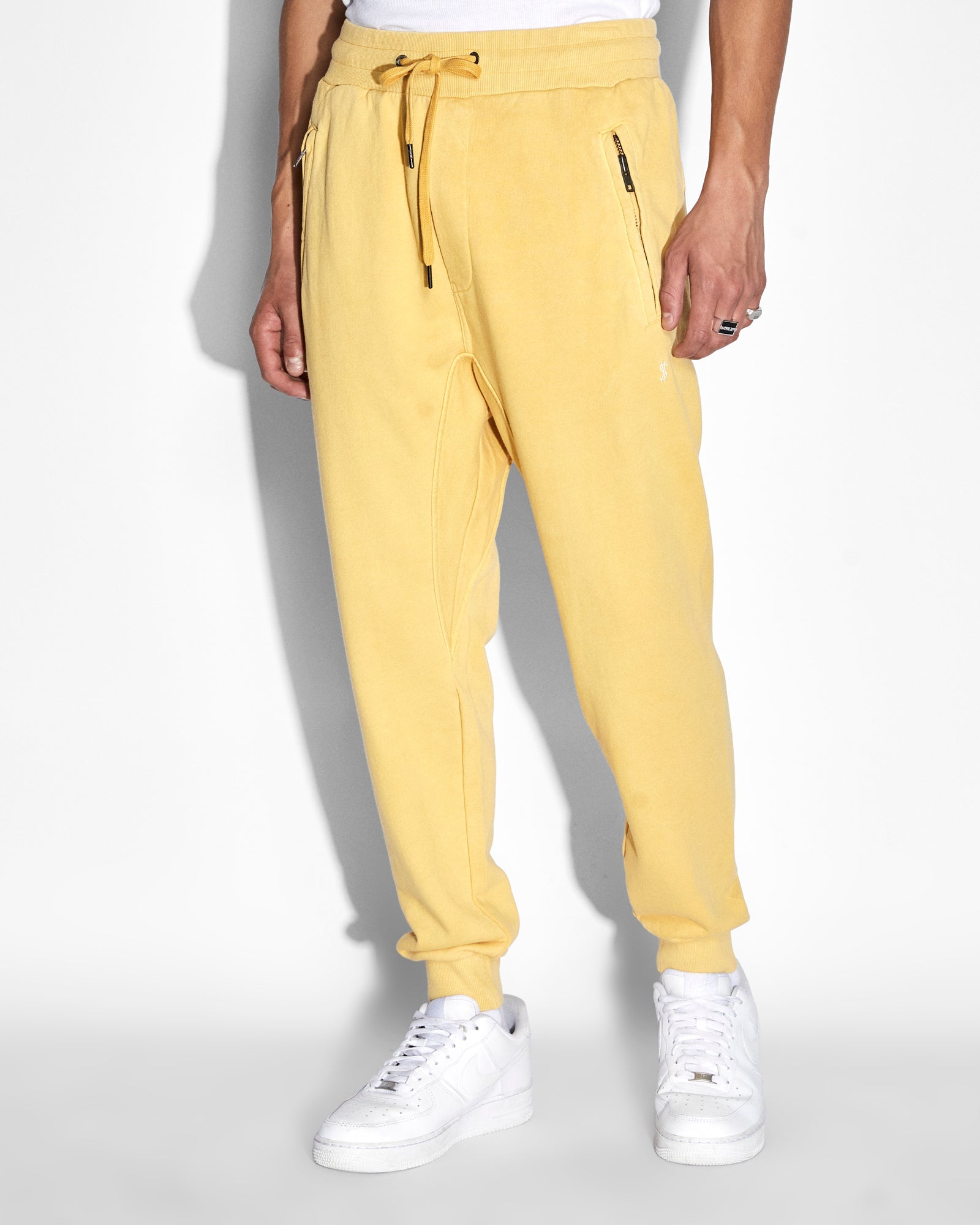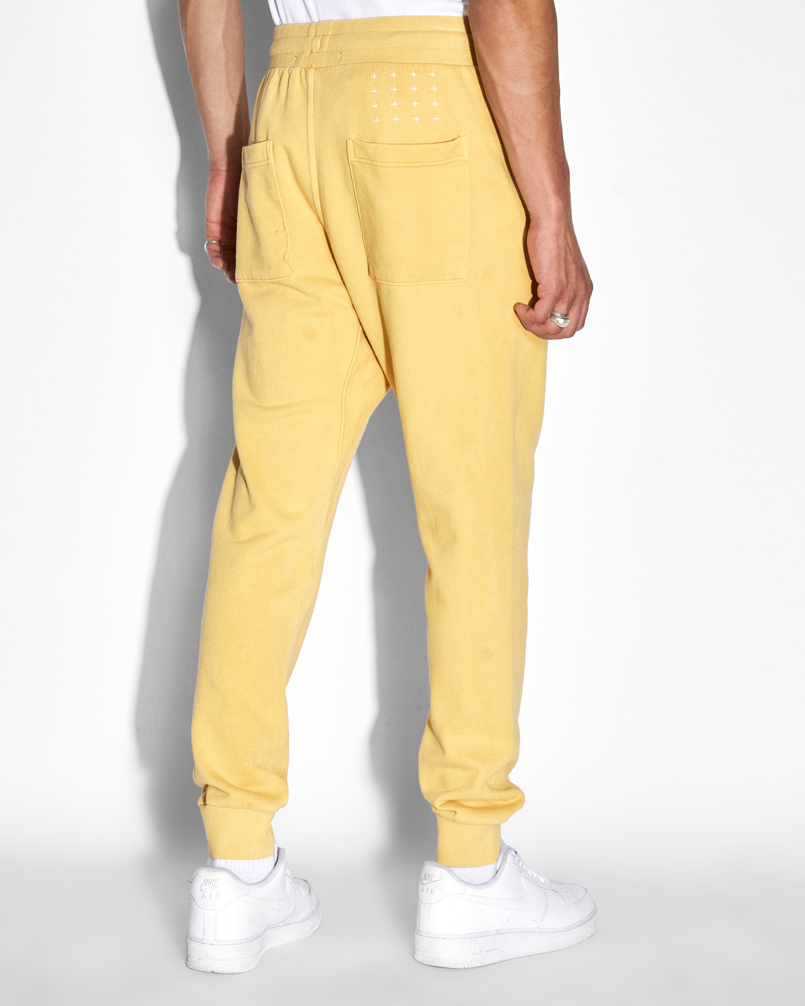 The 4 X 4 Trak Sol is made from premium loopback cotton fleece in our custom yellow 'sol' colourway with a fleece wash and is detailed with white Ksubi branding. This mid rise, relaxed fit track pant is a tapered cut style featuring rib hem cuffs, a drawstring through an elasticated rib waistband, slanted welt pockets with a zipper closure at the front and patch pockets at the back.