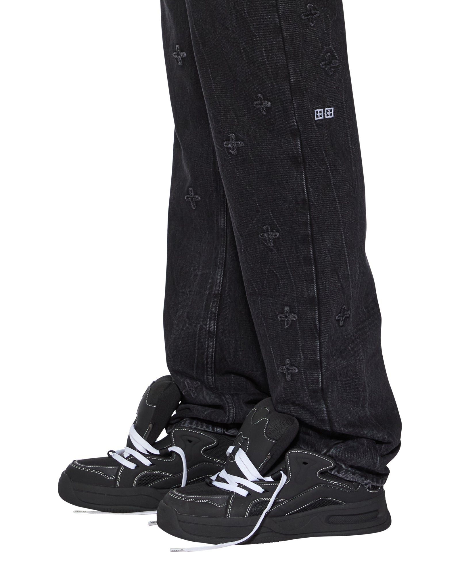 The Anti K Black Marble Kplus is a mid-rise relaxed straight fit with a regular leg opening. Made from premium rigid black denim with a heavy stone wash, it features applique plus artworks stitched onto the garment from top to bottom, with a concentration towards the hem. Finished with signature T-box and 4x4 embroidery, ghost patching detailing, and Ksubi branded hardware.