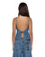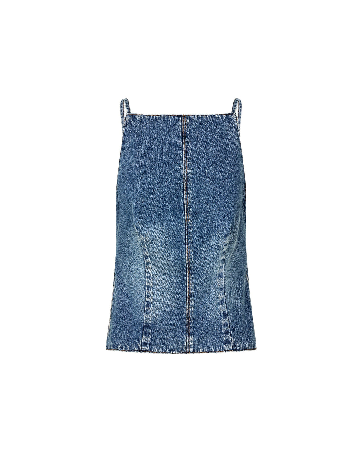 The Apron Top Relik features a square high neckline and a full-length design crafted from premium rigid denim in a mid-blue enzyme wash with a neutral tint. With adjustable rouleau straps and an open back with tie detailing, this top is fully lined and accented with subtle grinding around the seams for a worn-in aesthetic. Finished with signature t-box branding, it's a versatile statement piece.