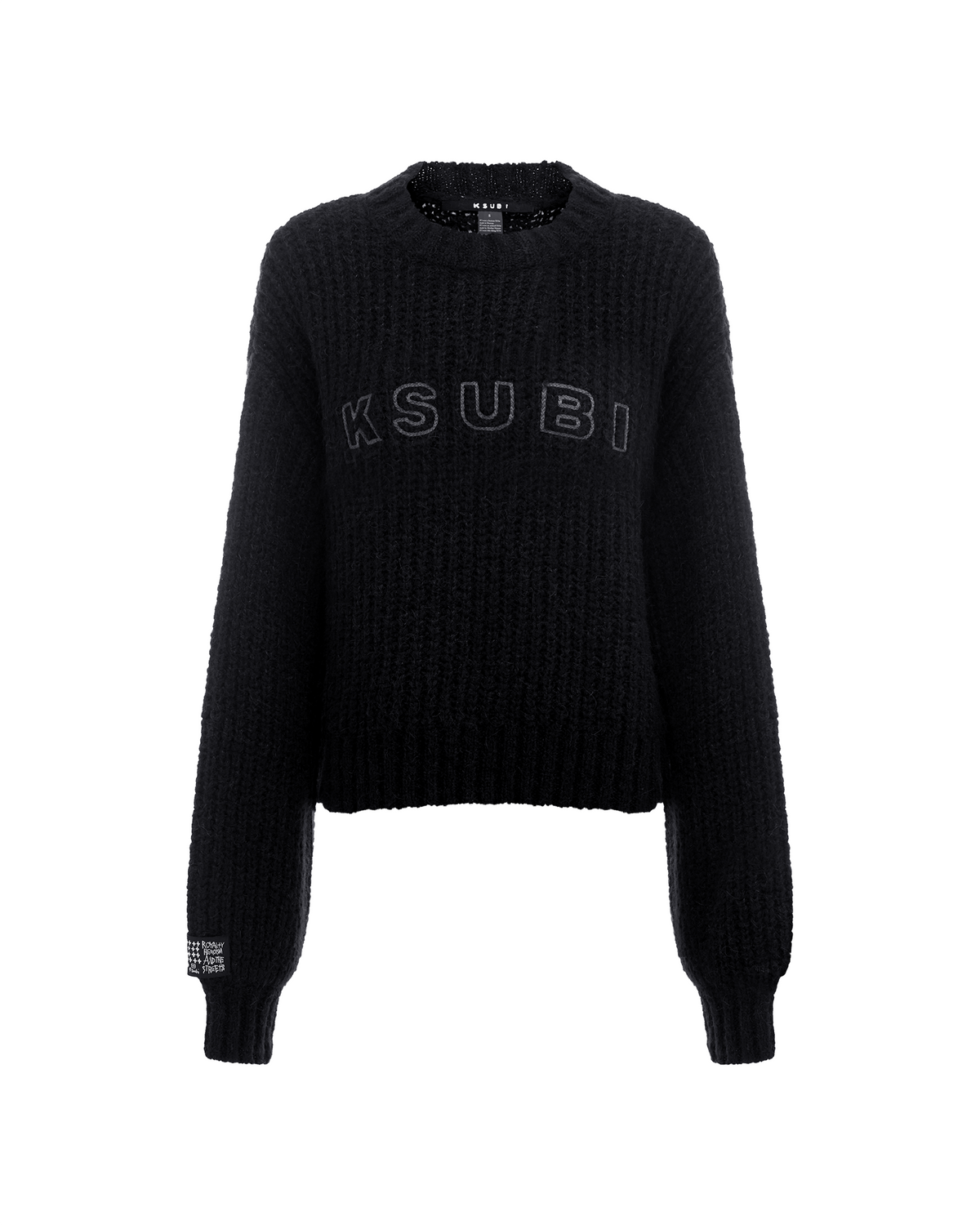 The Bookie Knit is an oversized sweater with a ribbed crew neckline and drop shoulder. Constructed from a wool-blend yarn, this relaxed charcoal knit is designed to be worn oversized. Featuring a classic Ksubi embroidery contrast across the front with a ribbed hem. Style the knit back with the Low Rider Carpenter Boneyard Black or any Ksubi jeans.