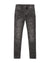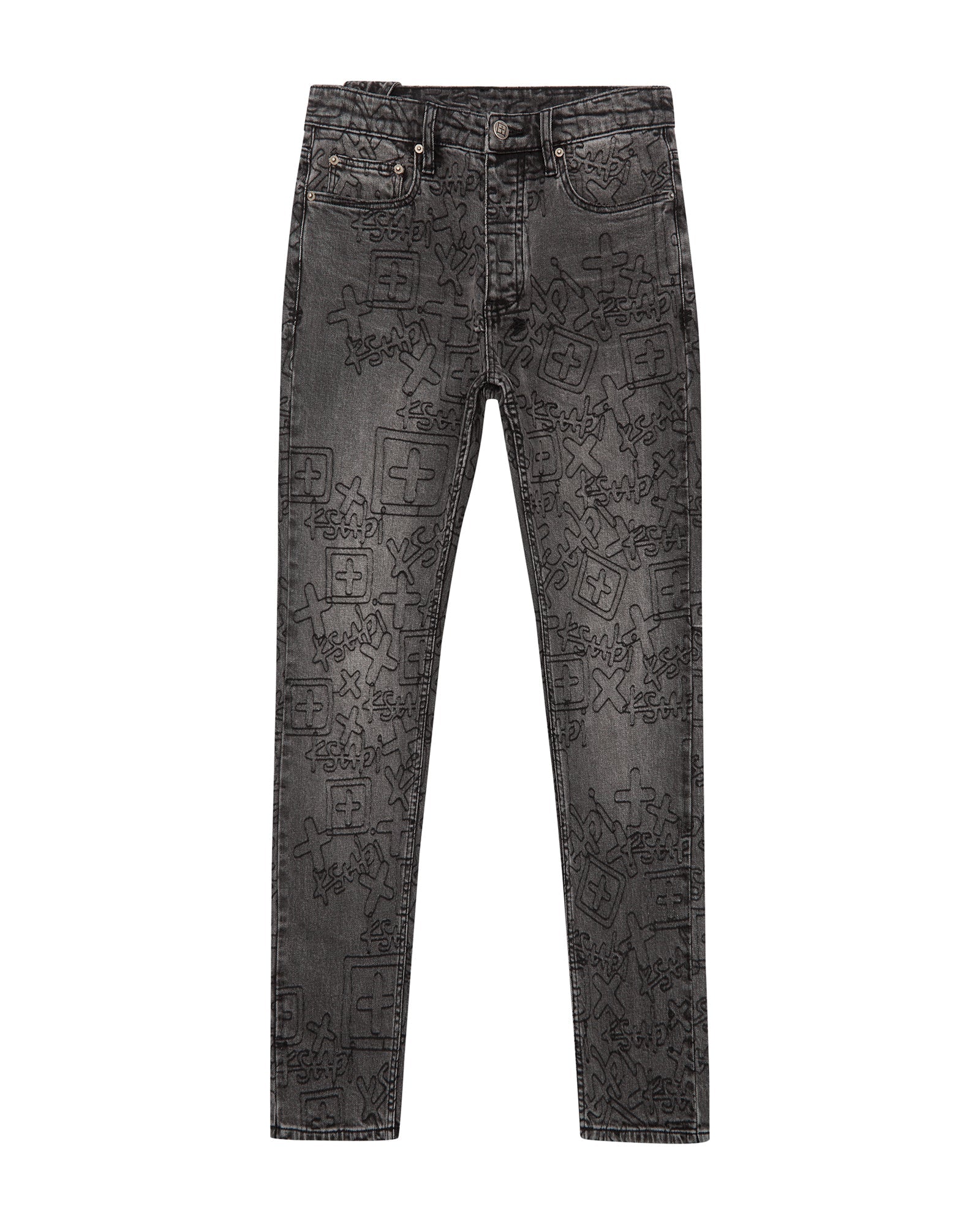 The Chitch Stencil Stitch Worn Grey features a slim tapered fit with a mid-long rise and signature dutch tab, crafted from premium comfort stretch black denim with a heavy stone wash. It showcases full garment embroidered artwork, finished with signature t-box and 4x4 embroidery, and Ksubi branded hardware.
