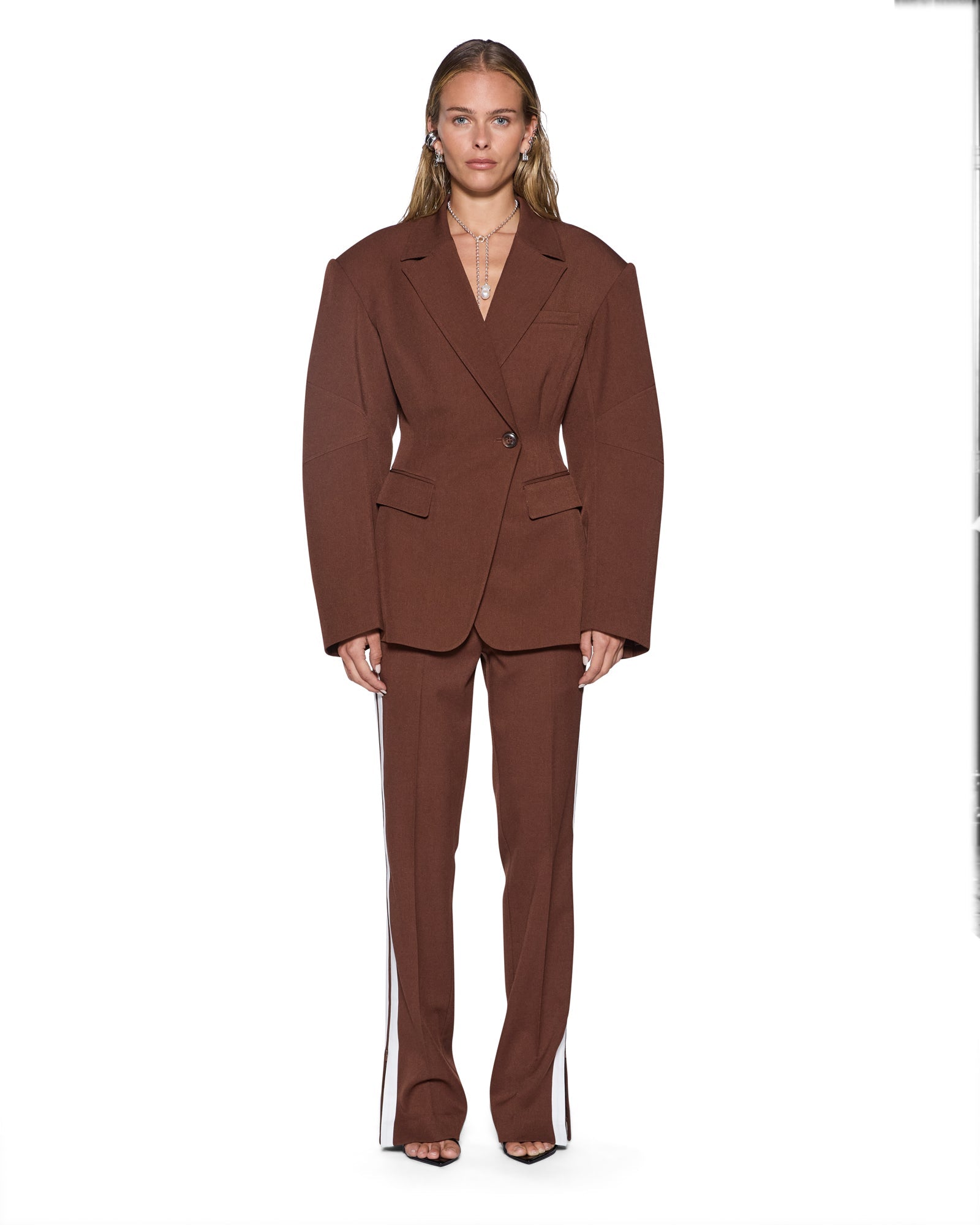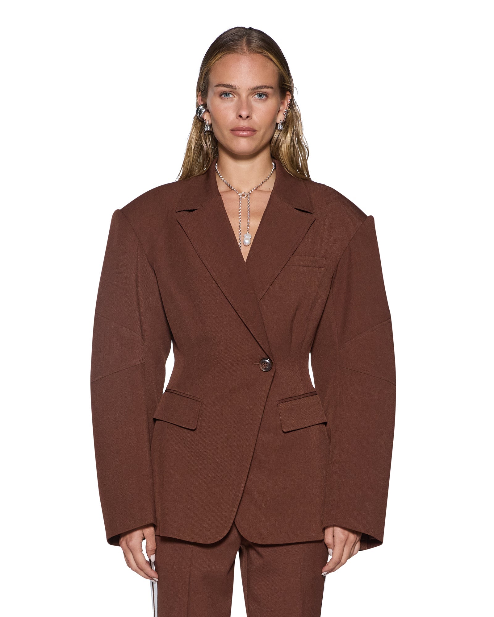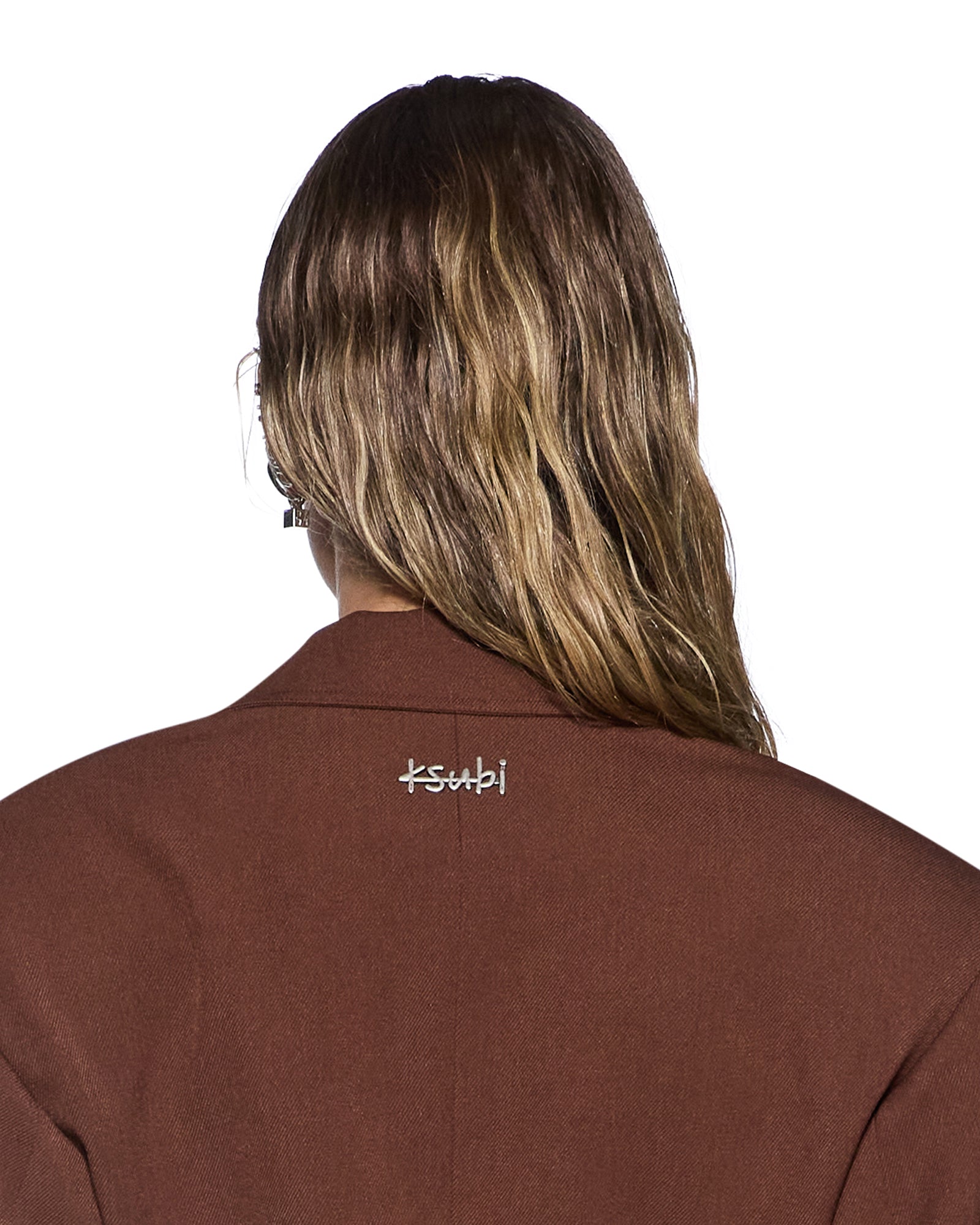 The Dare Cinched Blazer Chocolate is an oversized blazer featuring a cinched waist, cocoon sleeves, and exaggerated drop shoulders for a contemporary tailored silhouette. Crafted from soft structured tailoring fabrication in a rich chocolate colourway and fully lined for a polished finish, the design includes an exaggerated collar, peak lapels, welt pockets, a single-button front closure with an internal jigger button, shoulder pads for structure, a double-breasted appearance, and Ksubi branded buttons with a signature anti-silver Ksubi rivet at the back neck.