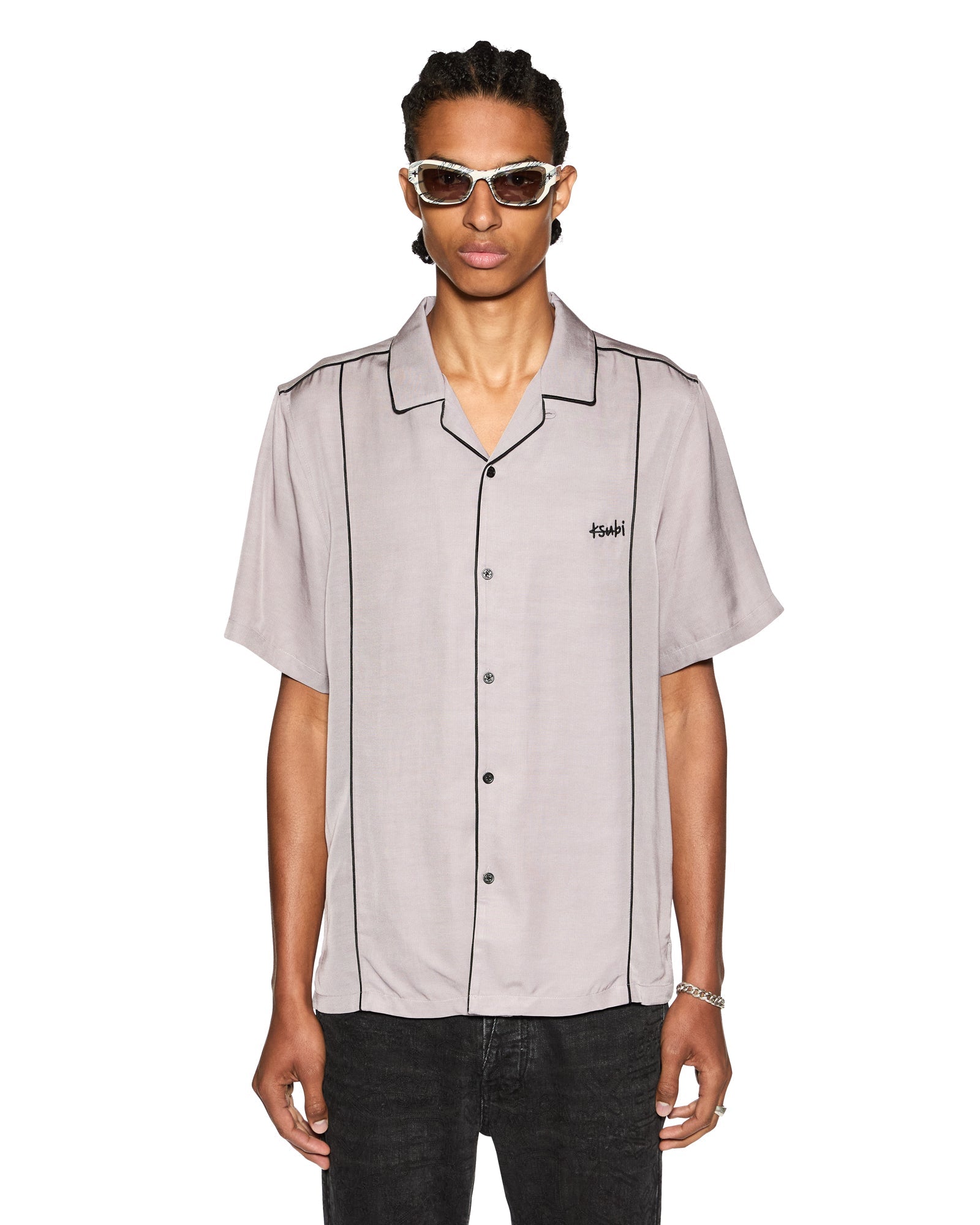 The Downtown Resort Short Sleeve Shirt is a relaxed, short sleeve resort shirt. Made from a premium viscose blend in a faded purple. Featuring a 1999 Ksubi logo on the chest and piping inserts. This shirt has front closure buttons nd signature t-box Ksubi branding.
