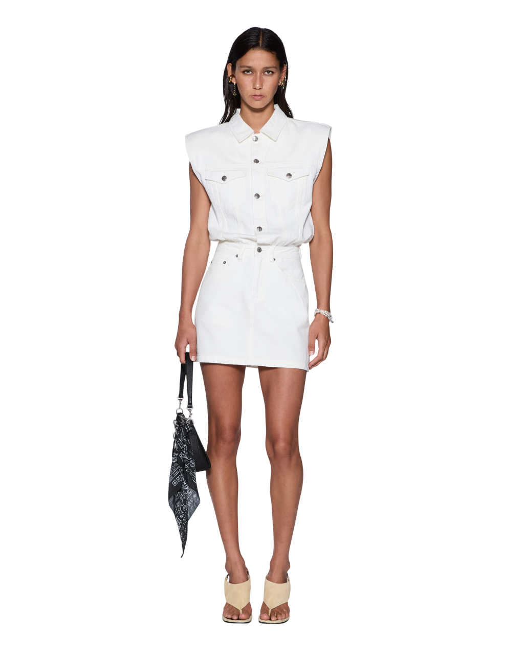 The Form Up Boilerdress Blanc is a sleeveless shirtdress designed with a relaxed blouson bodice and fitted mini-length skirt silhouette. Crafted from premium rigid lightweight white denim, the style features a button-up collar, classic denim panel lines, encased shoulder pads for a strong structured shape, trucker-inspired panelling, and is finished with anti-silver Ksubi branded hardware, 3x4 and T-box embroidery.