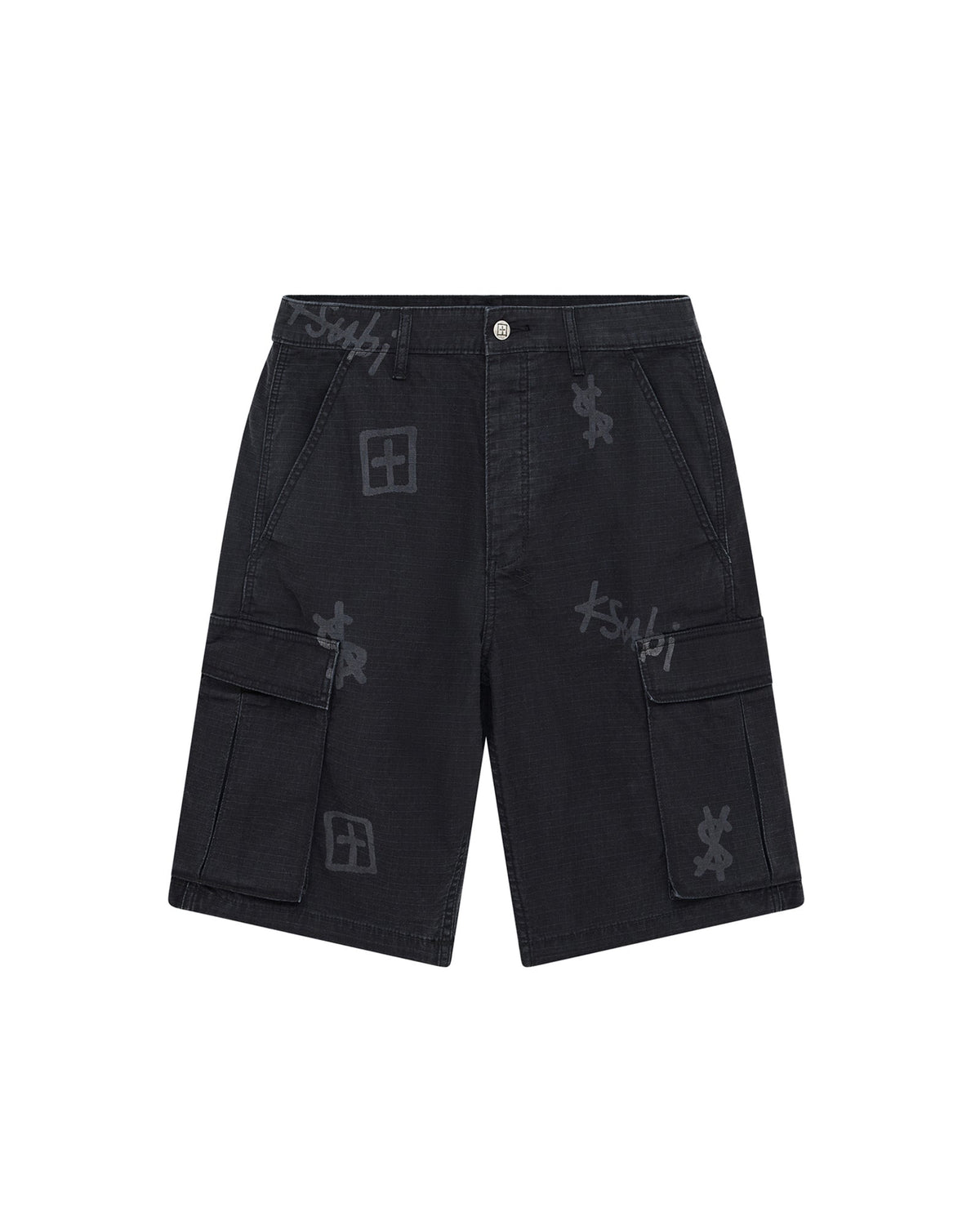The Fugitive Cargo Short Kash Box is a mid-rise relaxed fitted cargo short with a fixed waistband shank button. Made from a cotton ripstop fabric with laser-printed yardage artwork. Details include side-facing cargo pockets, diagonal cutaway pockets, and back press-studded welt pockets. Finished with signature T-box and 4x4 embroidery and Ksubi branded hardware.