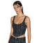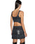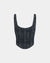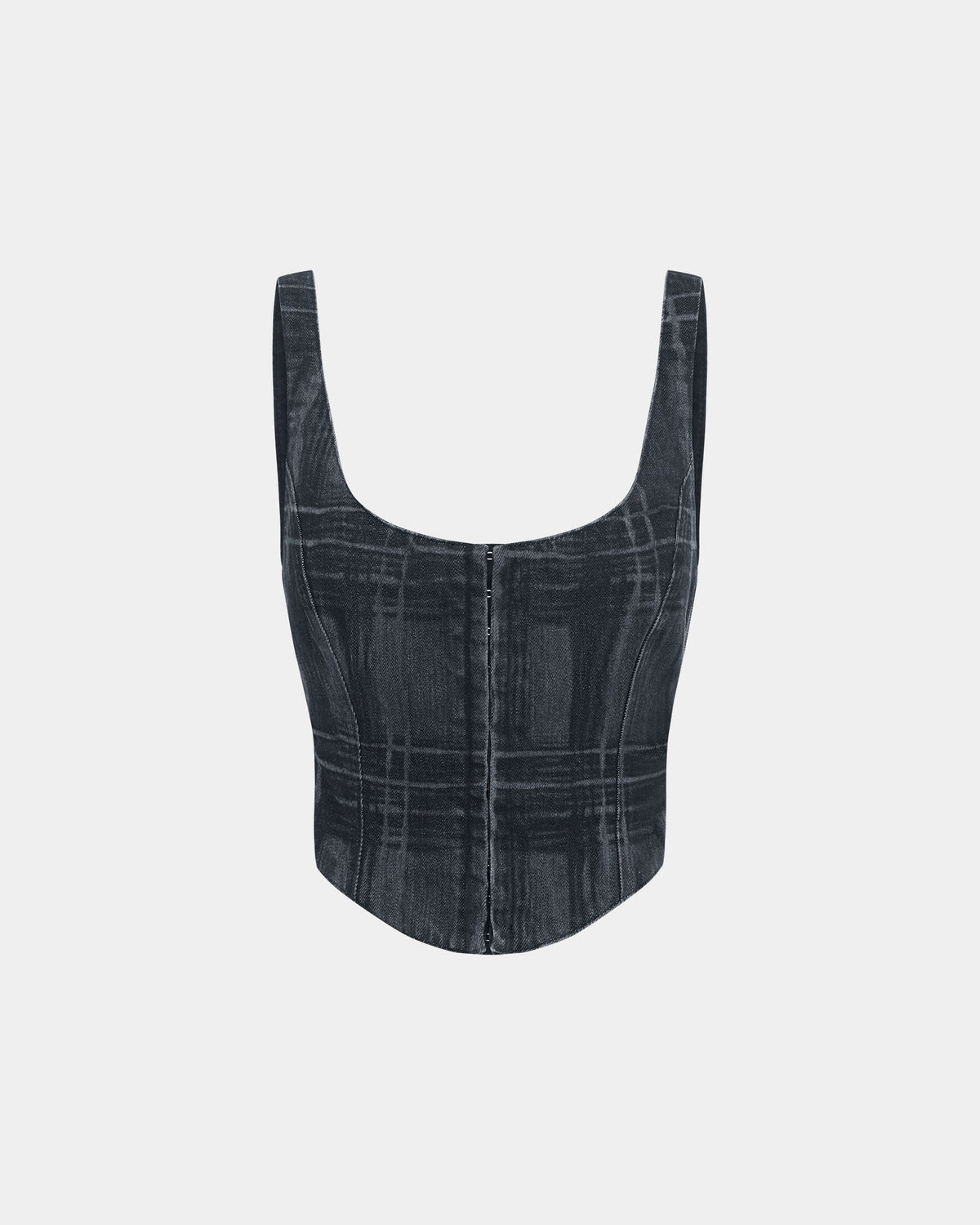 The Gigi Bustier Skool is a cropped bustier made from a blue and black stretch denim fabric with a custom etched plaid all over pattern. This fitted, square neck top features hook and eye fastenings through the centre front and a curved hem. Style back with the matching Soho Skool for a matching plaid set.