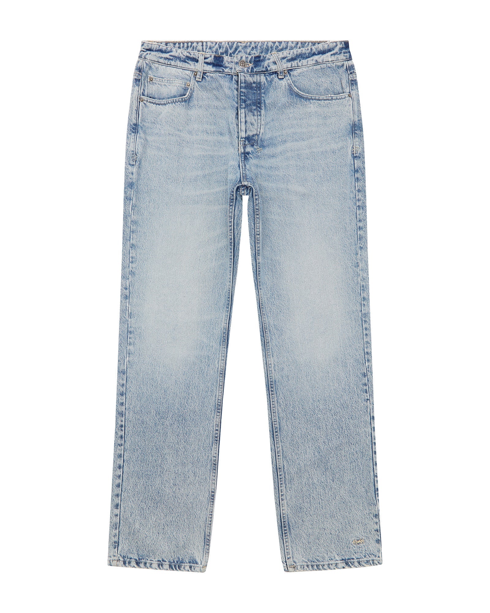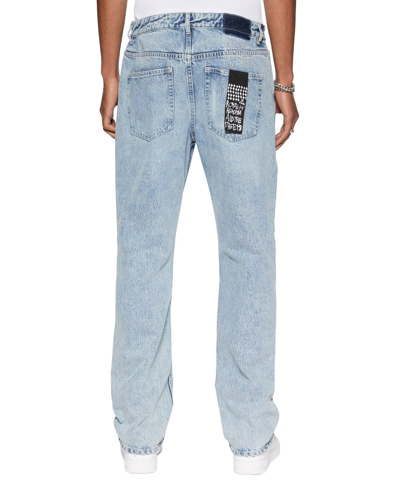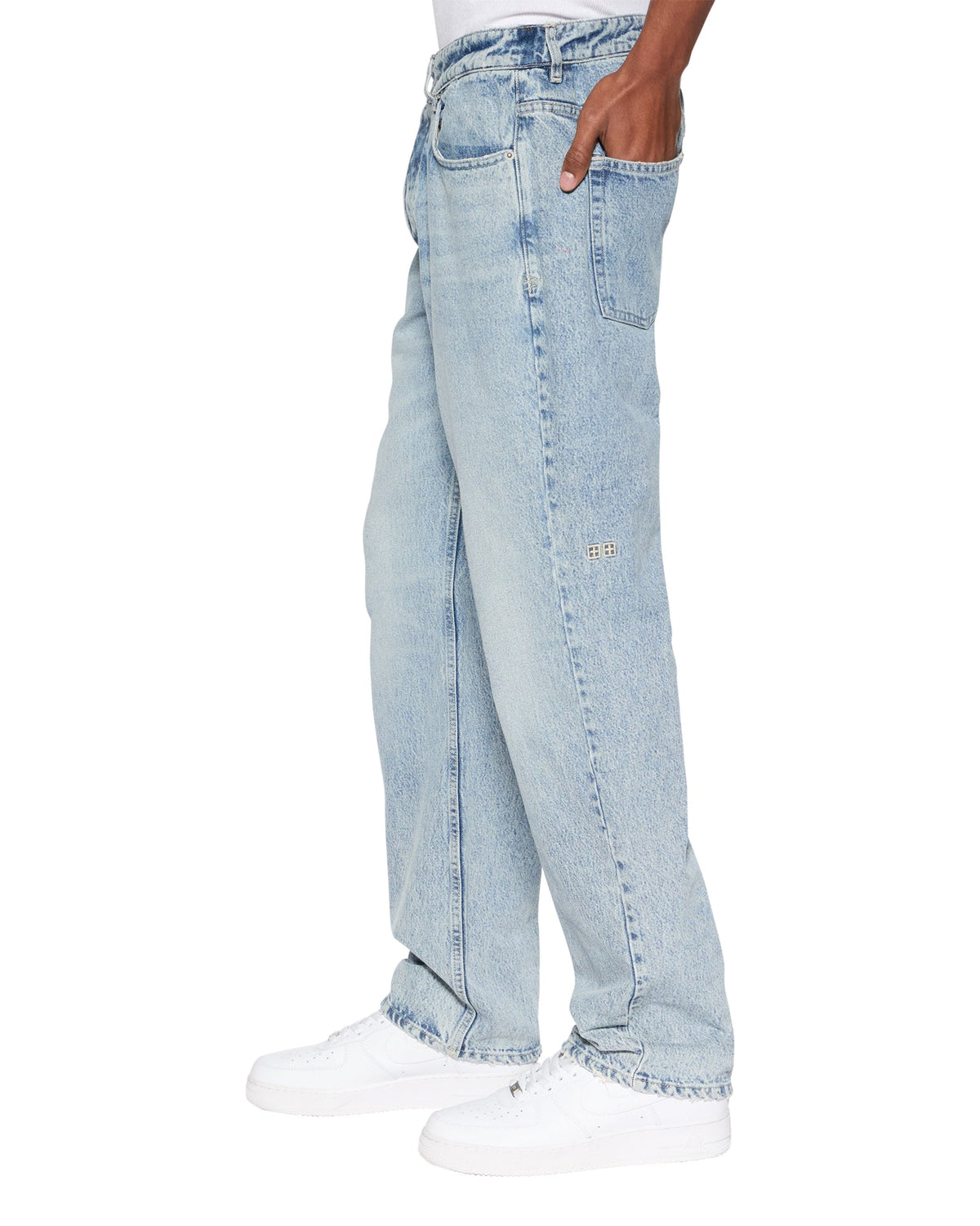 The Hazlow Champagne features a mid-rise, relaxed straight leg with a regular leg opening. Made from European comfort stretch indigo denim with an acid wash, it is finished with signature t-box and 4x4 embroidery, ghost patching detailing, and Ksubi branded hardware.