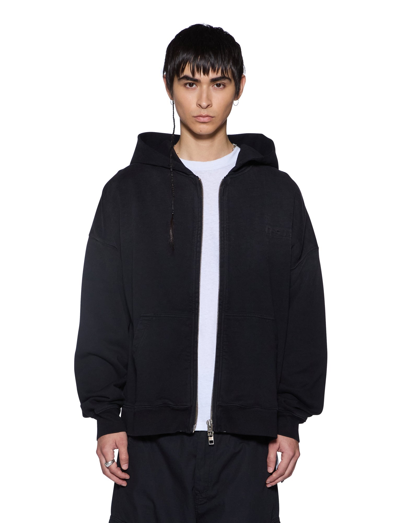 The Intruder Ekcess Zip Hoodie Jet Black is a boxy oversized fit hoodie with a single piece hood, zip through front closure, front pouch pocket and rats tail detail. Made from premium loopback fleece in a jet black colourway, it features a debossed sign of the times logo at the front crest and top of hood. Finished with t-box and 4x4 embroidery branding.