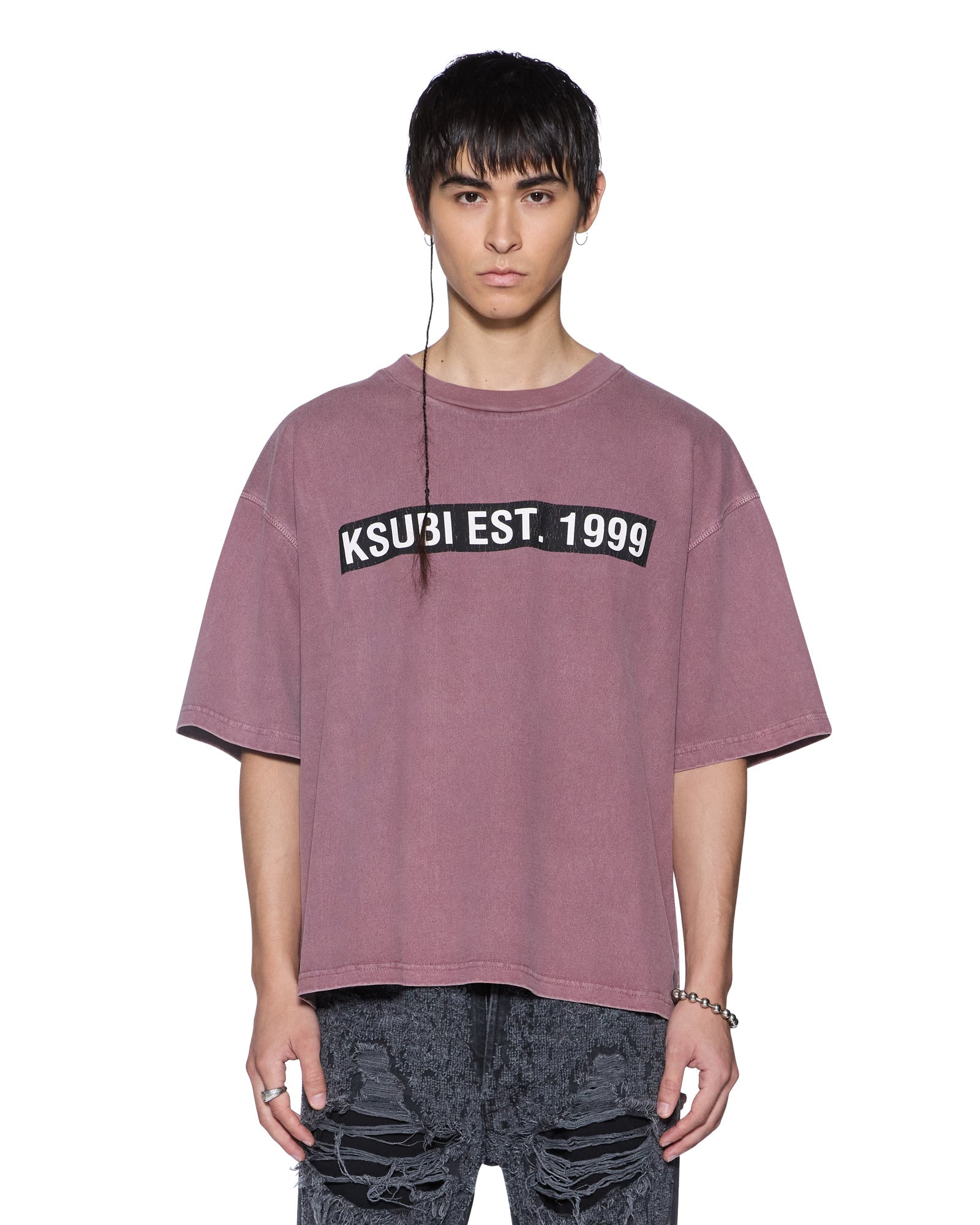 The Kings Halen Ss Tee Vintage Plum is a boxy oversized fitting, waist-finishing length tee with an exaggerated shoulder drop, reverse overlocked side seam and signature rats tail. Made from heavyweight cotton jersey in a garment dyed plum purple with an aged wash, it features screen printed seasonal artwork at the front. Finished with signature t-box and 4x4 branding.