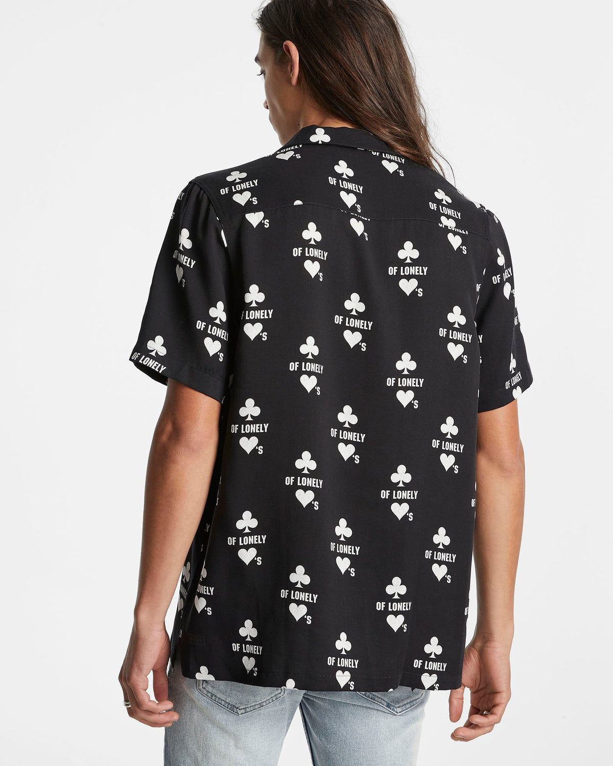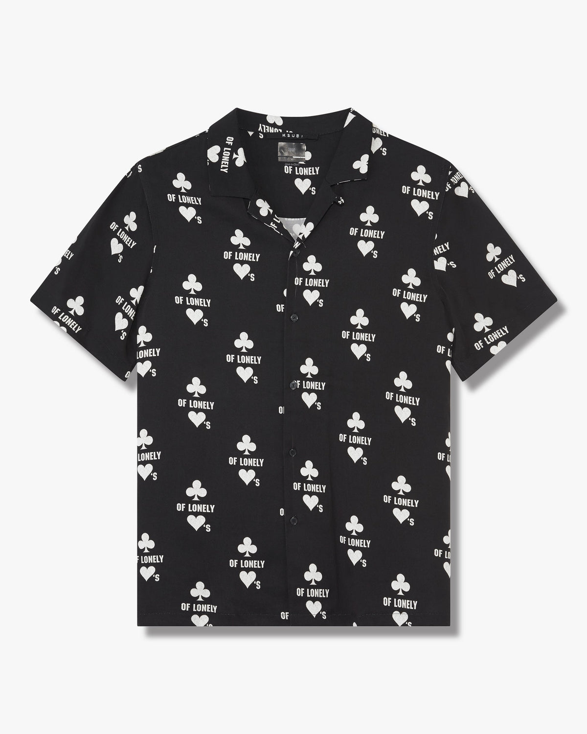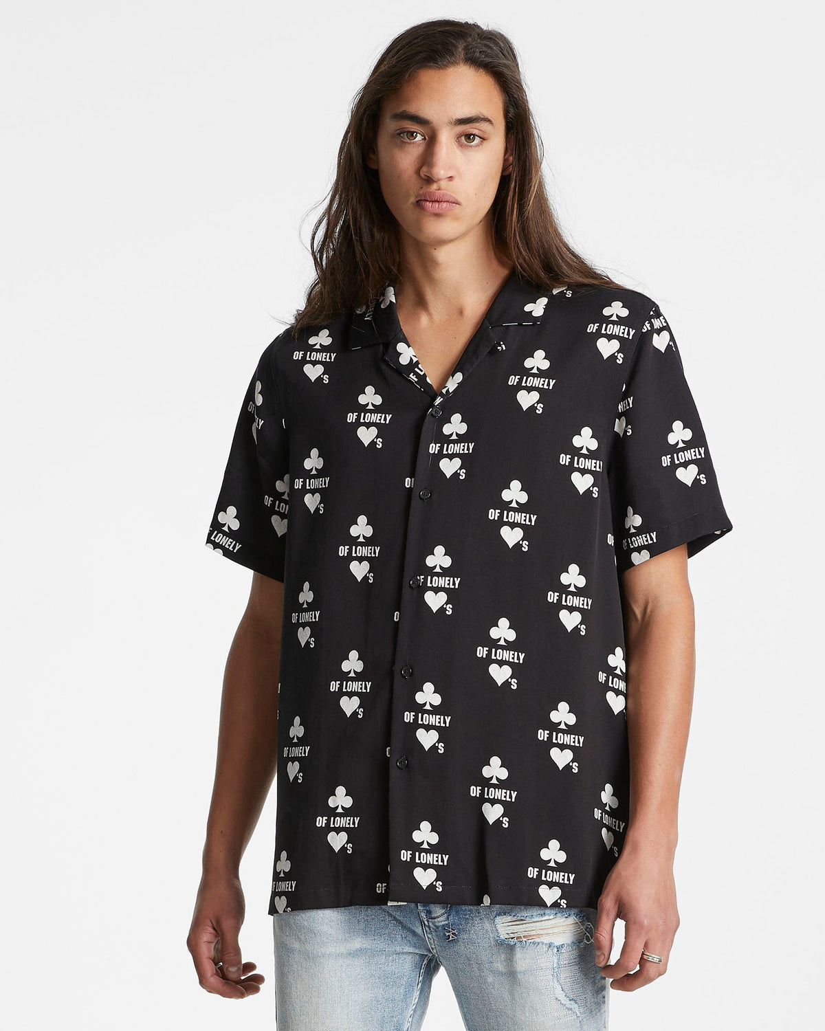 The Klub Of Hearts Resort Short Sleeve Shirt Black is a printed button up shirt. Designed for a relaxed fit with step hem and made from a premium lyocell with light garment wash; this black shirt features original Ksubi prints, t-box branding and branded hardwear.