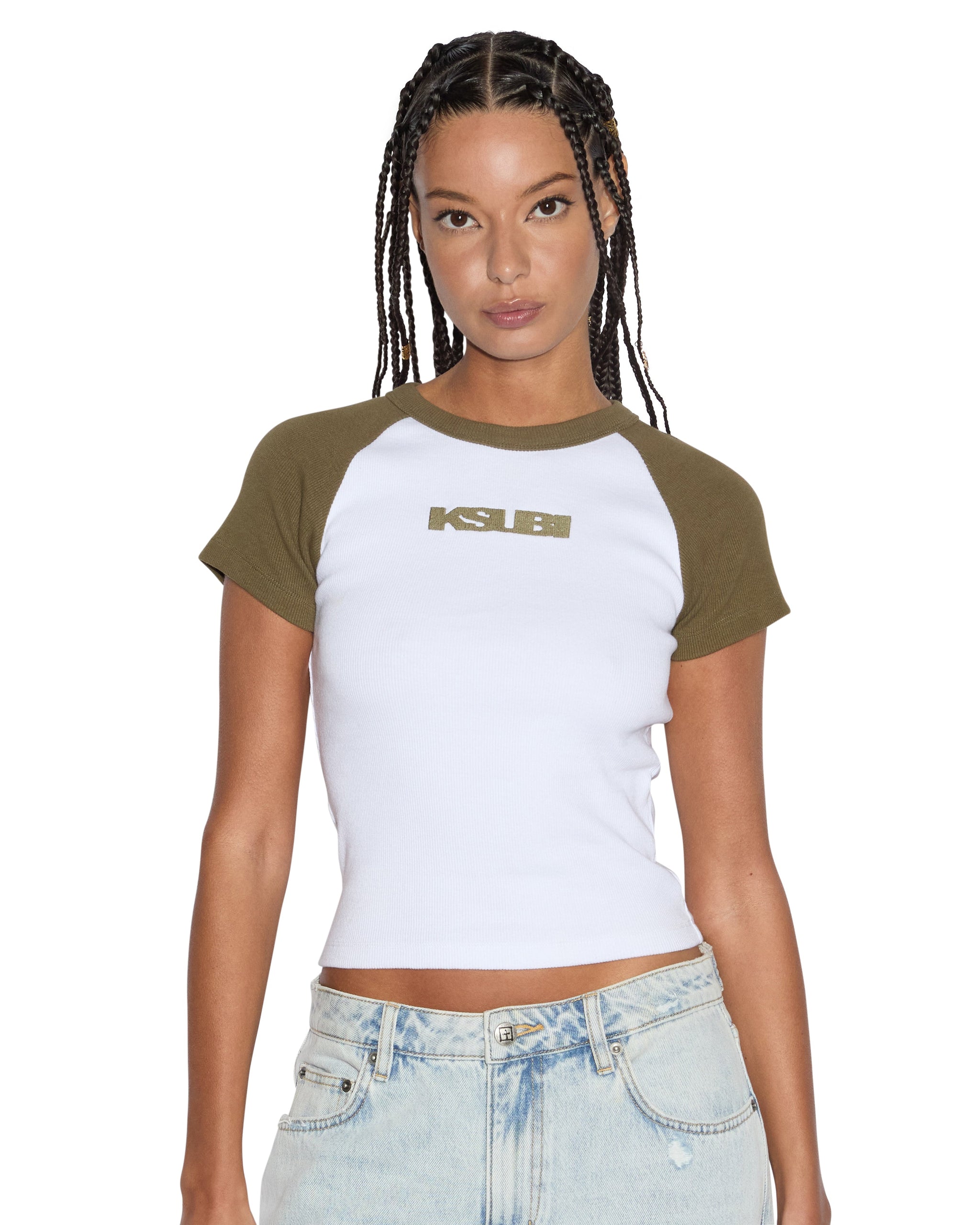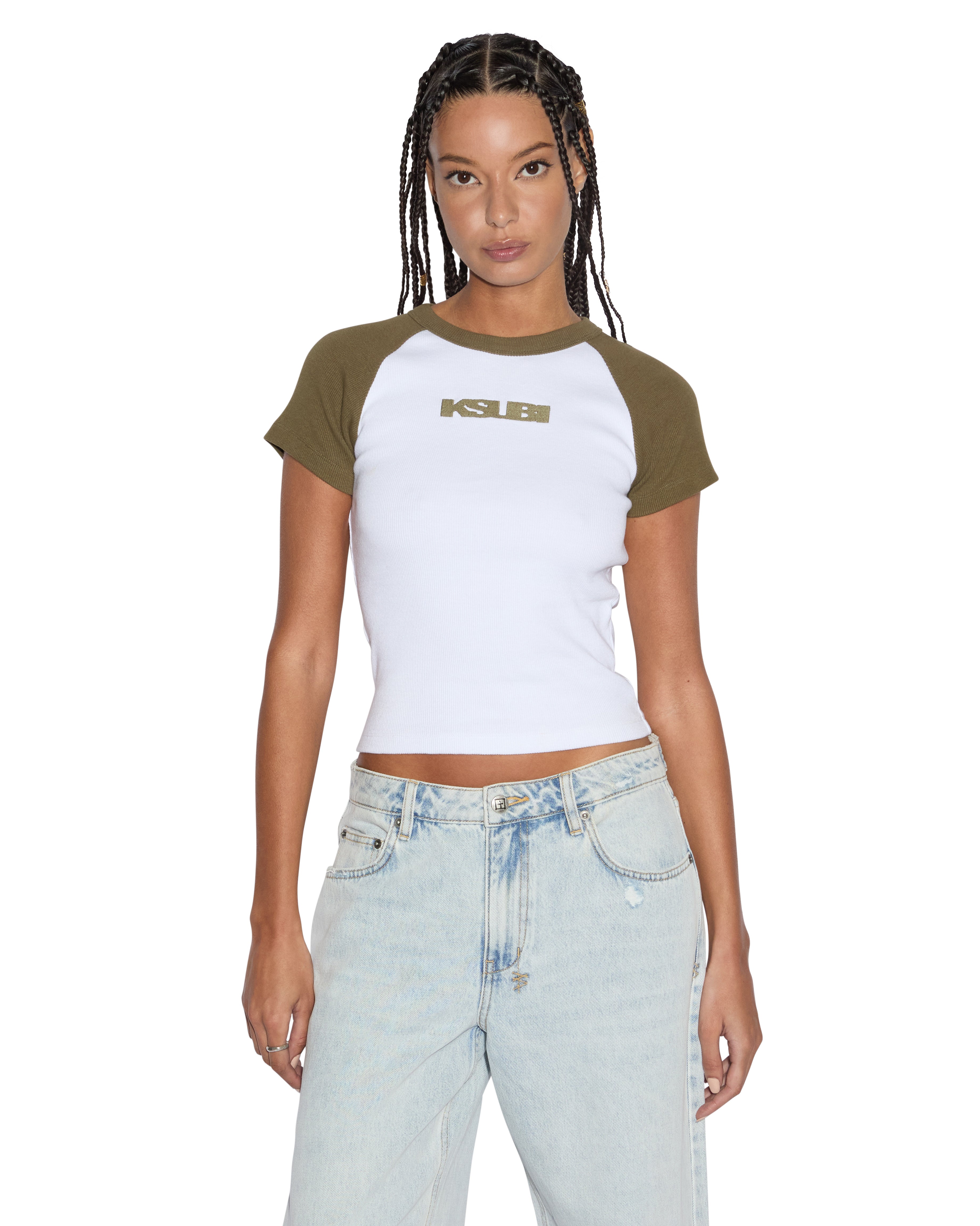 The Ksb Baby Ringer Ss Tee Khaki/White is a cropped crew neck t-shirt made from cotton blend ribbed jersey. This fitted baby tee has a white base with a contrast khaki sleeves, neck blinding and the Ksubi logo graphic across the front chest.