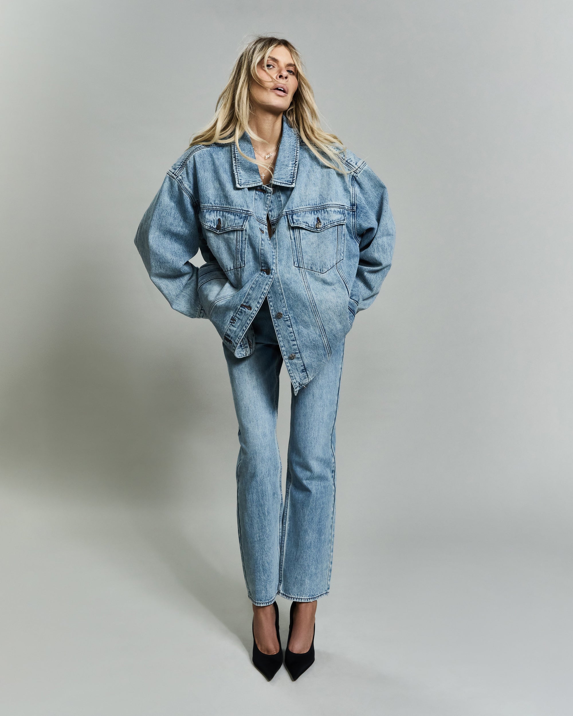 The Ksuper Jacket is an exaggerated oversized trucker jacket, inspired by a borrowed-from-the-boys aesthetic. Made from premium rigid denim in a classic stonewashed mid blue, it features traditional trucker panelling, pocketing details, grinding, and soft sanding, finished with the collaboration T-box, signature 3x4 embroidery, back tabs, branded Ksubi shanks on the front button-through opening, and a removable key ring.