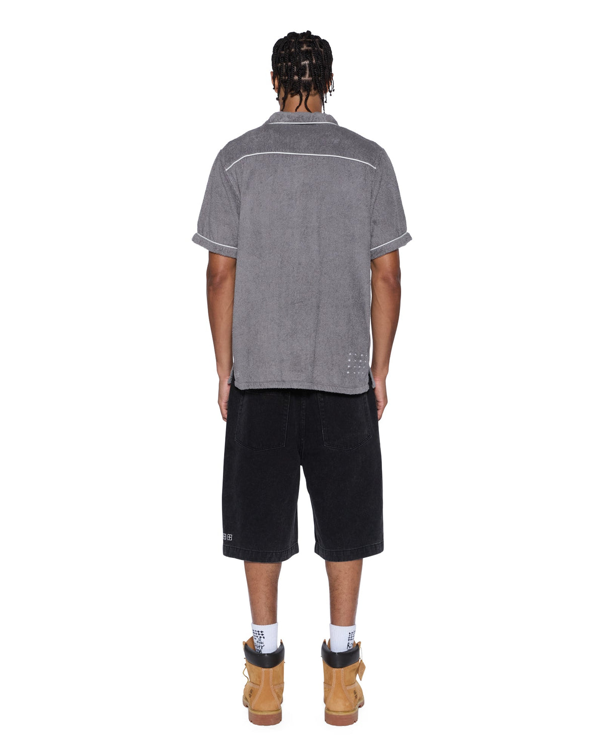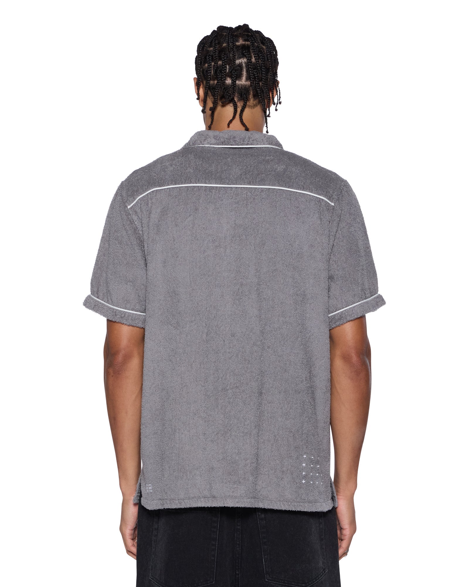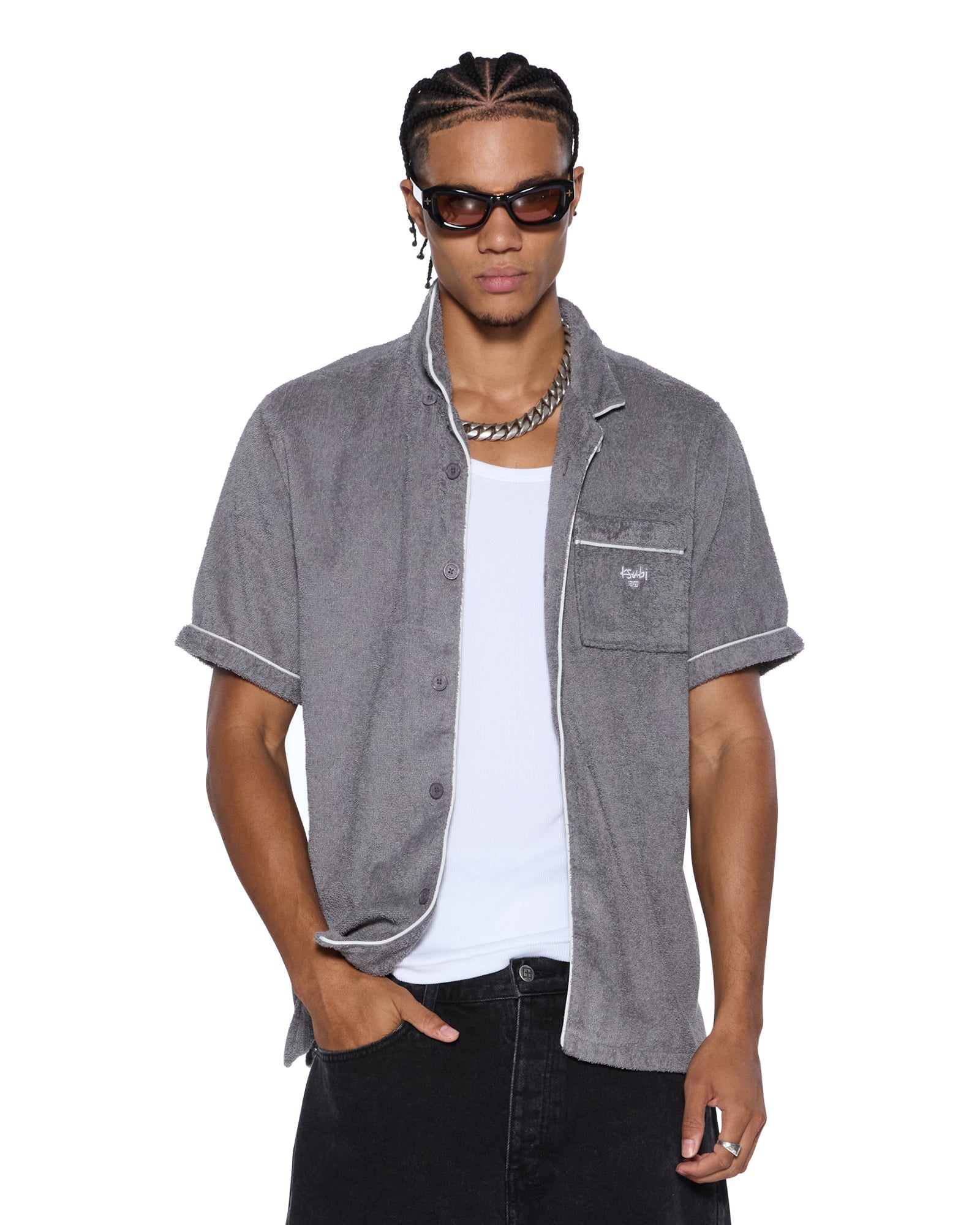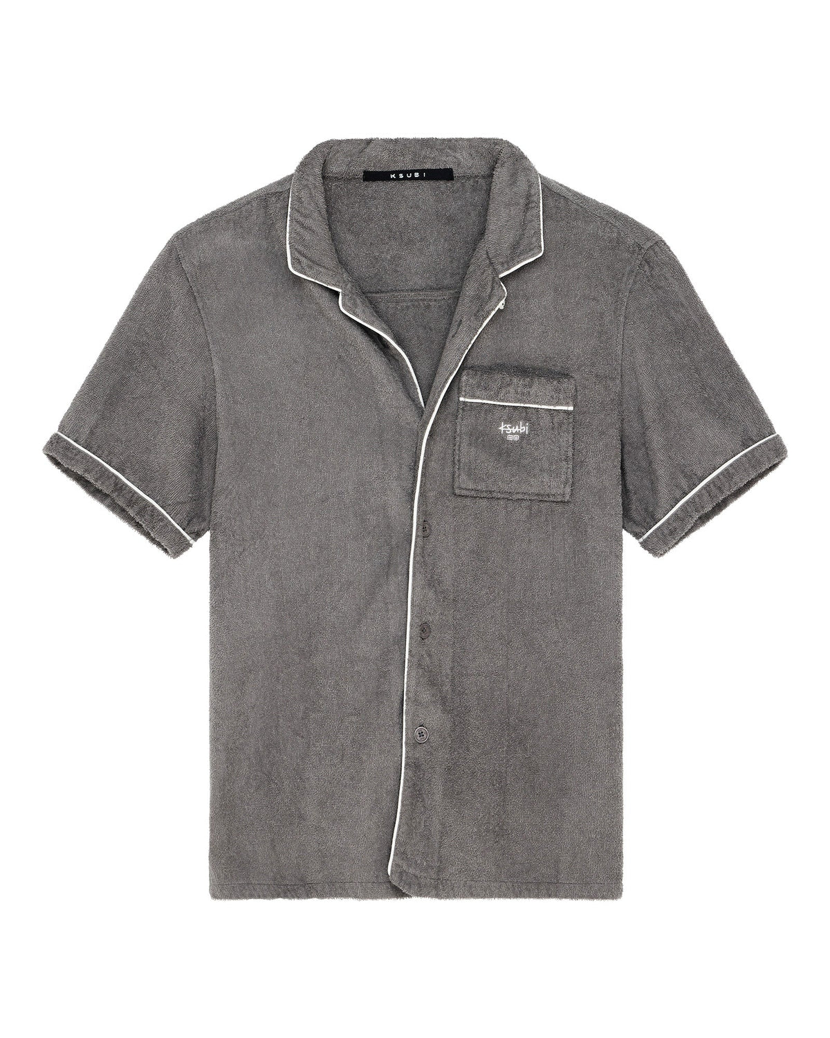 The Lounge SS Resort Shirt Charocal is a relaxed-fit short sleeve resort shirt made from premium terry towelling. Featuring white piping, premium branded buttons at the front closure, and signature Ksubi t-box printed branding, this shirt combines comfort and style for effortless wear.