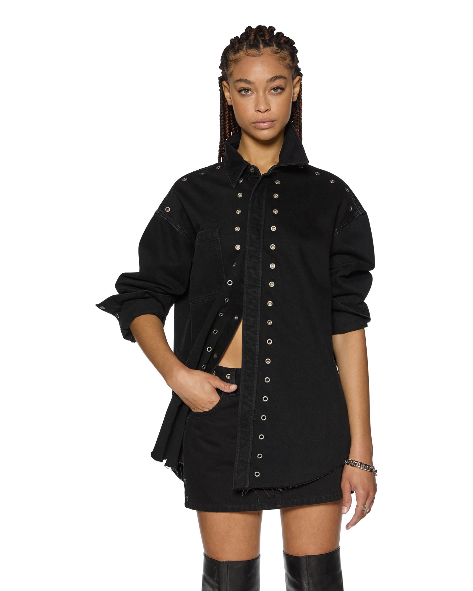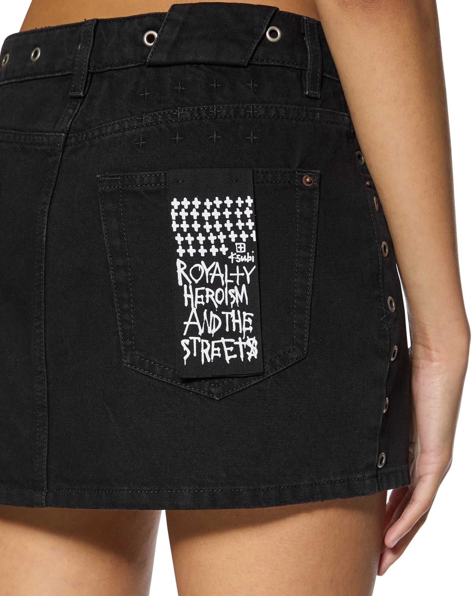 The Low Rider Mini Vice is a low-rise mini skirt with classic five-pocket styling, crafted from premium European rigid denim in lightly washed black. Featuring silver eyelet detail around the waistband and down the side seams, this skirt is finished with Ksubi branded hardware, T-box embroidery, and 3x4 branding. Designed to sit lower on the hips, style it with the matching Oversized Shirt Split Vice for a coordinated look.