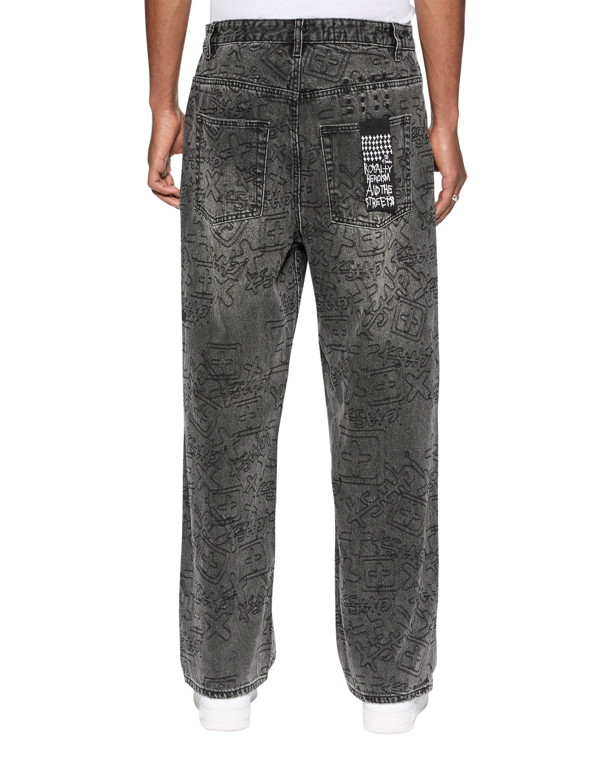 The Maxx Stencil Stitch is an exaggerated straight-leg jean with a long rise. Made from rigid black denim with a heavy stonewash, it features full-garment embroidered artwork and is finished with signature T-box and 4x4 embroidery and Ksubi hardware.
