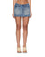 The Micro Mini Denim Skirt Painter Blue sits low on the hips and is crafted from premium rigid indigo mid-blue denim with a warm tinted wash and high-wear contrast detailing. The style is distressed with heavy grinding at the waistband, pocket edges, and hems, featuring rip-and-repair patches, subtle oil blotches, and paint markings for an authentic vintage aesthetic. Finished with cut-off front carpenter panels, an embossed waistband tab in ghost patch placement, classic five-pocket styling, Ksubi branded anti-silver hardware, and signature T-box embroidery.