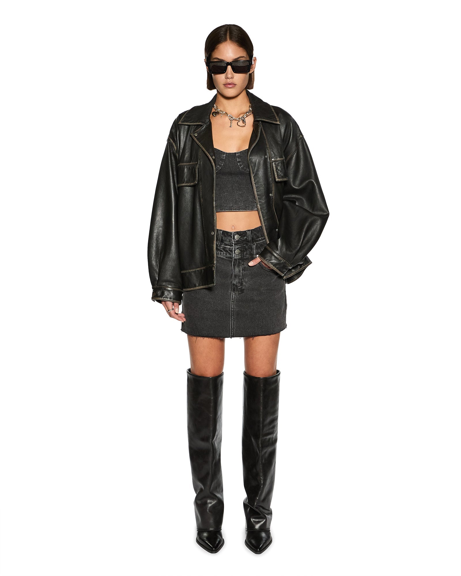 The Model Mini Rework Shadow is a high wasted mini skirt with a double waistband and raw cut hem. Made from a rigid heavy washed back denim, it features Ksubi t-box and 3x4 embroidery, as well as a removeable pocket tag and silver hardware.