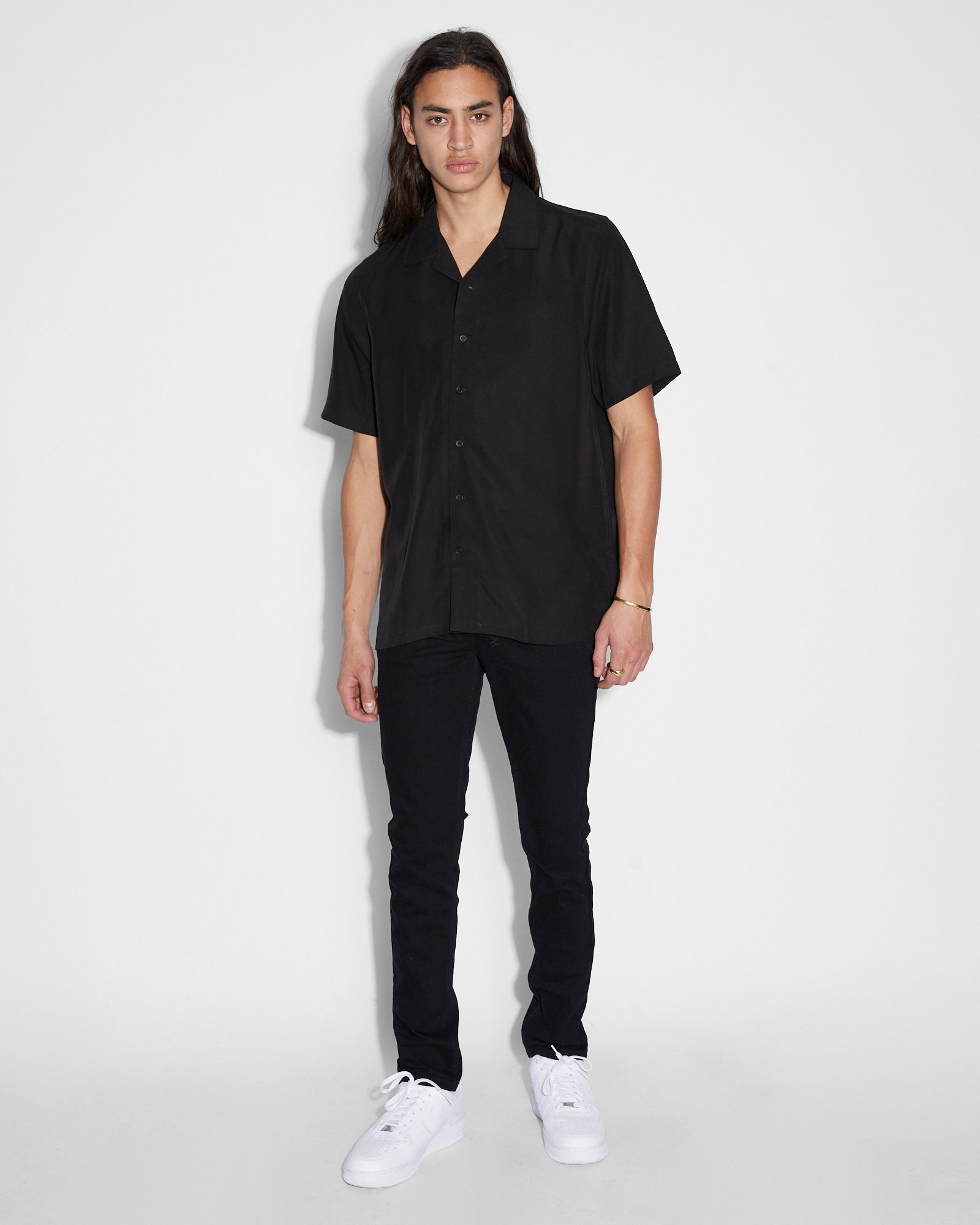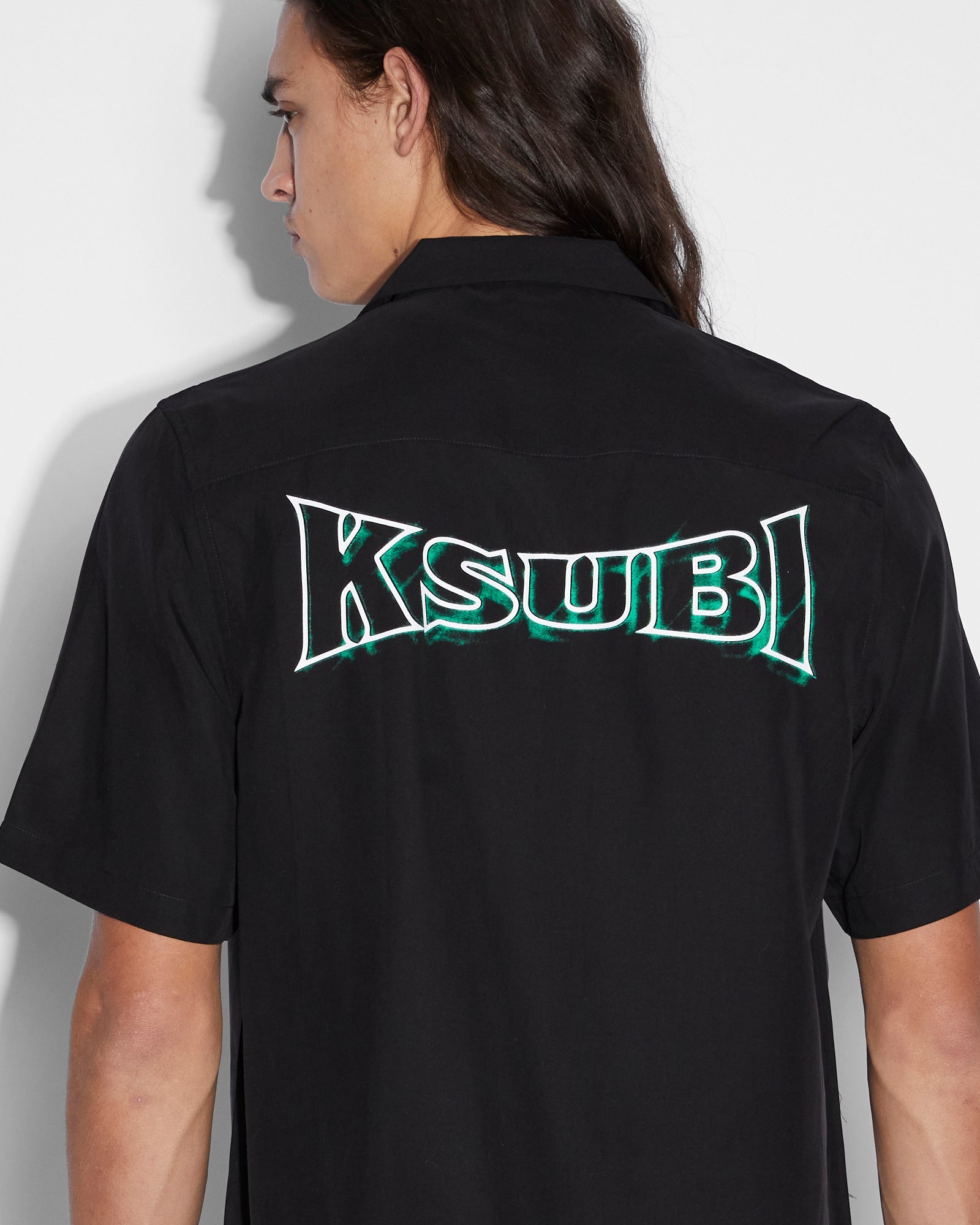 The Neon Resort Ss Shirt Black is a relaxed, short sleeve shirt made from a premium Tencel material. This shirt is detailed with a digitally printed original artwork on the back and features a pressed open collar, front button closure, side seam splits and iconic Ksubi branding.