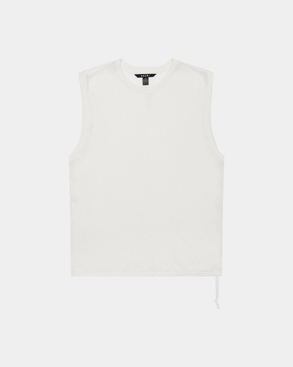 The Networth Tank White is a sleeveless mesh top made from a white knitted cotton net. This tank features rib bound hems, the signature rats tail and t-box branding.