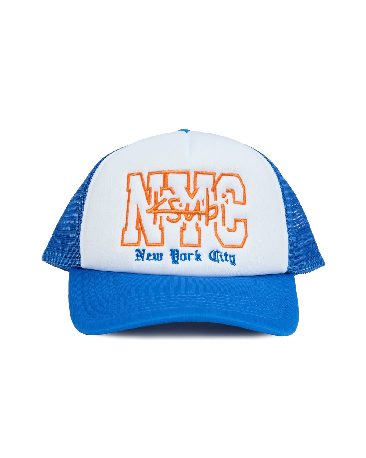 The NYC And The Streets Trucker Cap in blue features a custom embroidered graphic across the front, mesh back panels, and an adjustable snap closure. Made to feel premium, this trucker cap nods to NYC streetwear, finished with clean stitch details and structured front panels for easy wear, on or off the street.