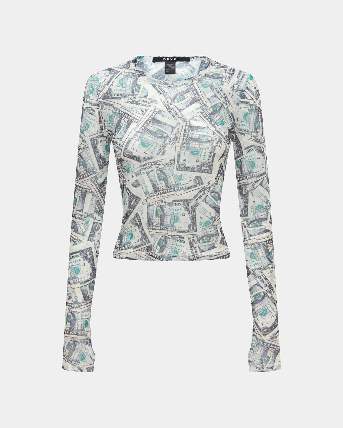 The Paper Ls Tee is a slim fitted, long sleeve tee made from a premium sheer mesh. This top features thumbholes for comfort and a custom money print for the seasonal collection. Detailed with a tonal t-box embrodiery on the side, this top is designed to be worn on its own as a statement piece or layered under a tee or vest.