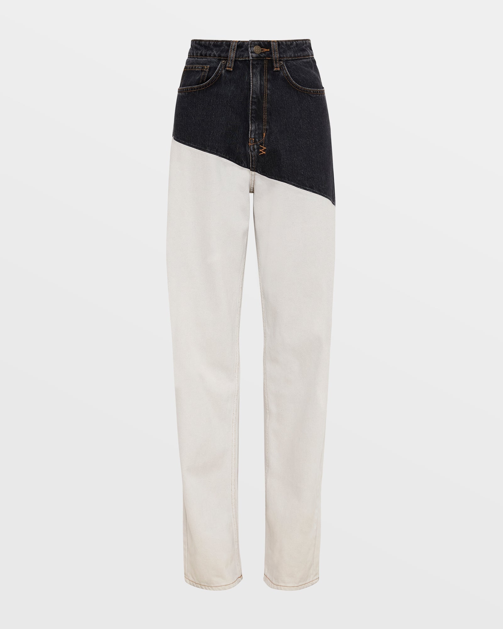 The Playback Black/Bone Spliced is made from two premium European rigid denim, one in natural wash and the other in dusted black stonewash. This pair has relaxed straight legs with a high waist and classic five pocket detailing. Completed with front and back contrast panels, Ksubi t-box embroidery and back cross embroidery.