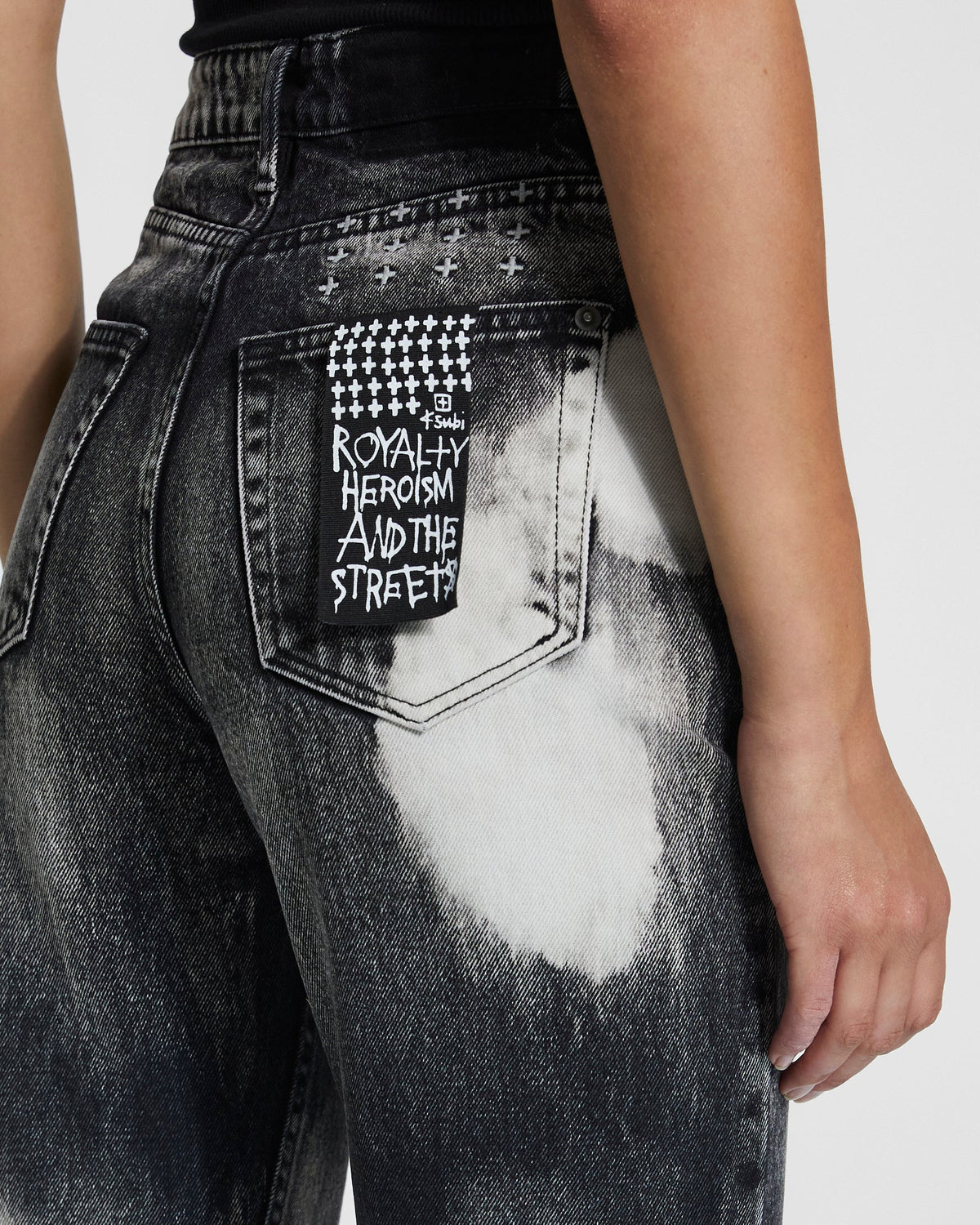 The Pointer Wreckoning features a high waist, relaxed leg which tapers at hem, ankle grazing length and light grinding. It is desgined with a zip fly, branded hardware, classic five pocket styling, Ksubi t-box, signature woven pocket tag and back cross embroidery. This style is made from premium rigid denim in a black wash with abstract bleached out effect, and each garment may slightly vary in bulk due to the unique wash effect.