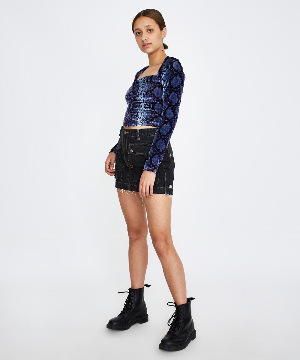 The Ponty Mython Long Sleeve Top is a long sleeve top made of a soft velvet fabrication in a blue colourway with snape print. This style features a square neckline, long sleeves, ruched detail at the bust, an exposed zip down the back and a cropped length.