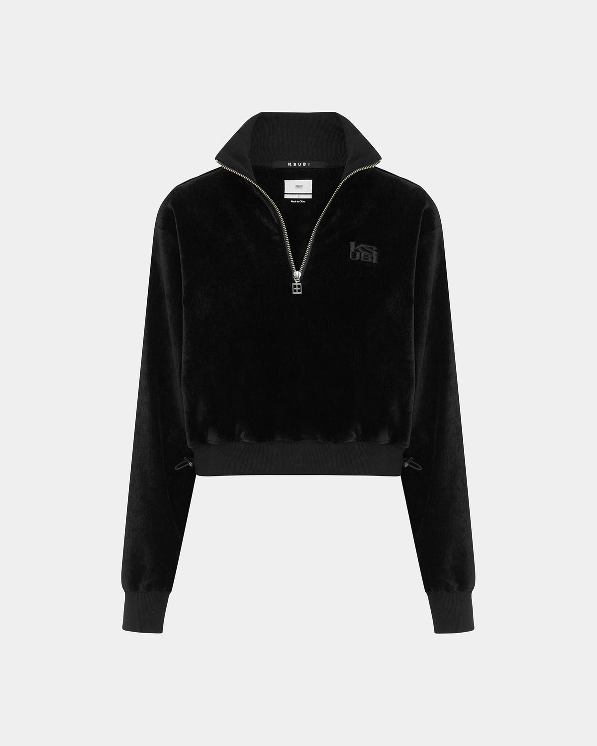 Make a statement with Ksubi's Y2K velour track set. The Richie Half Zip Crop Black is a cropped fit, made from a premium black velour with front Ksubi embroidery logo. This sweater features Ksubi branded hardware and bungee cord at the rib waistband, giving the styling option as a super-cropped top to style back with the matching low-rise Richie Origin Trak Black.