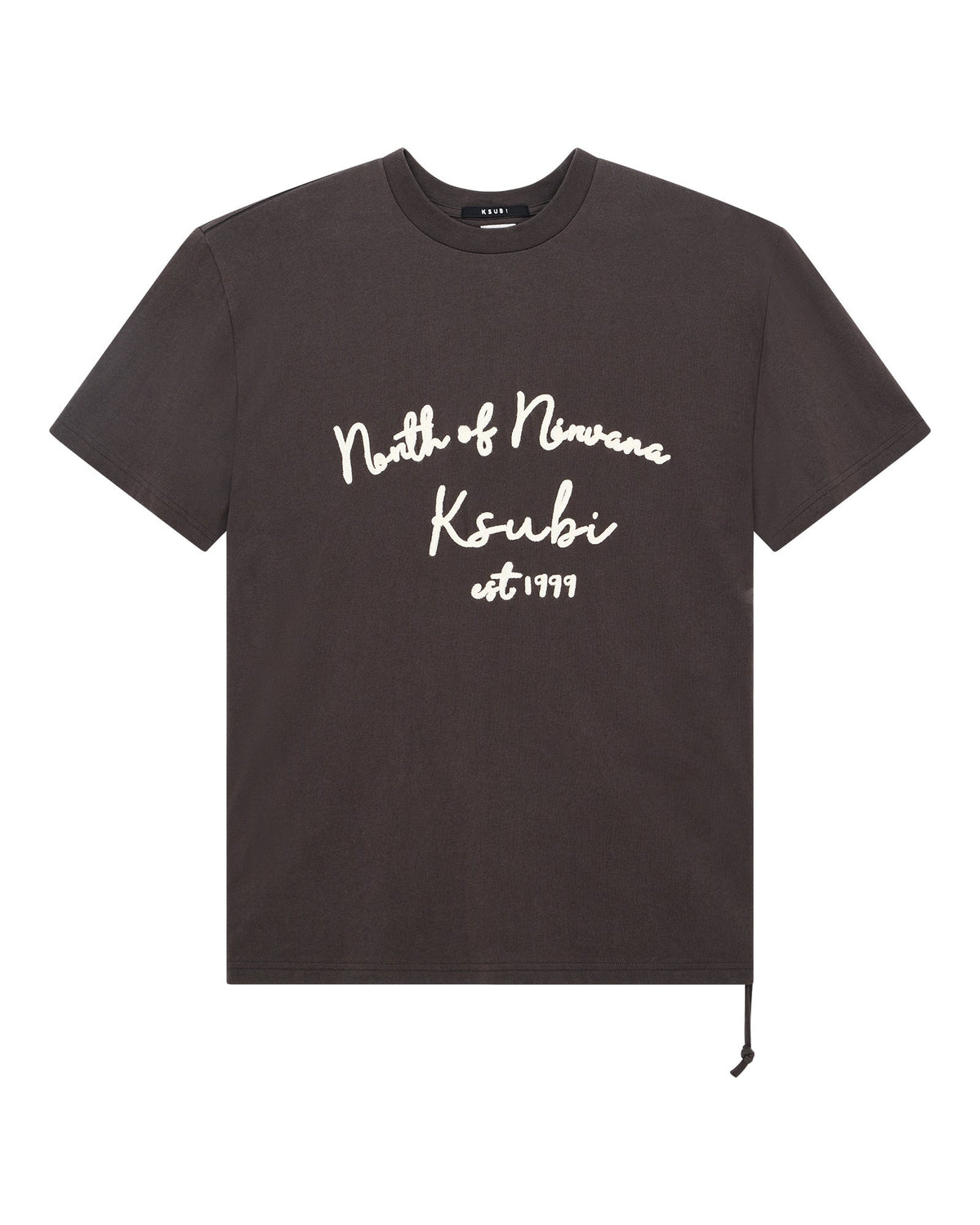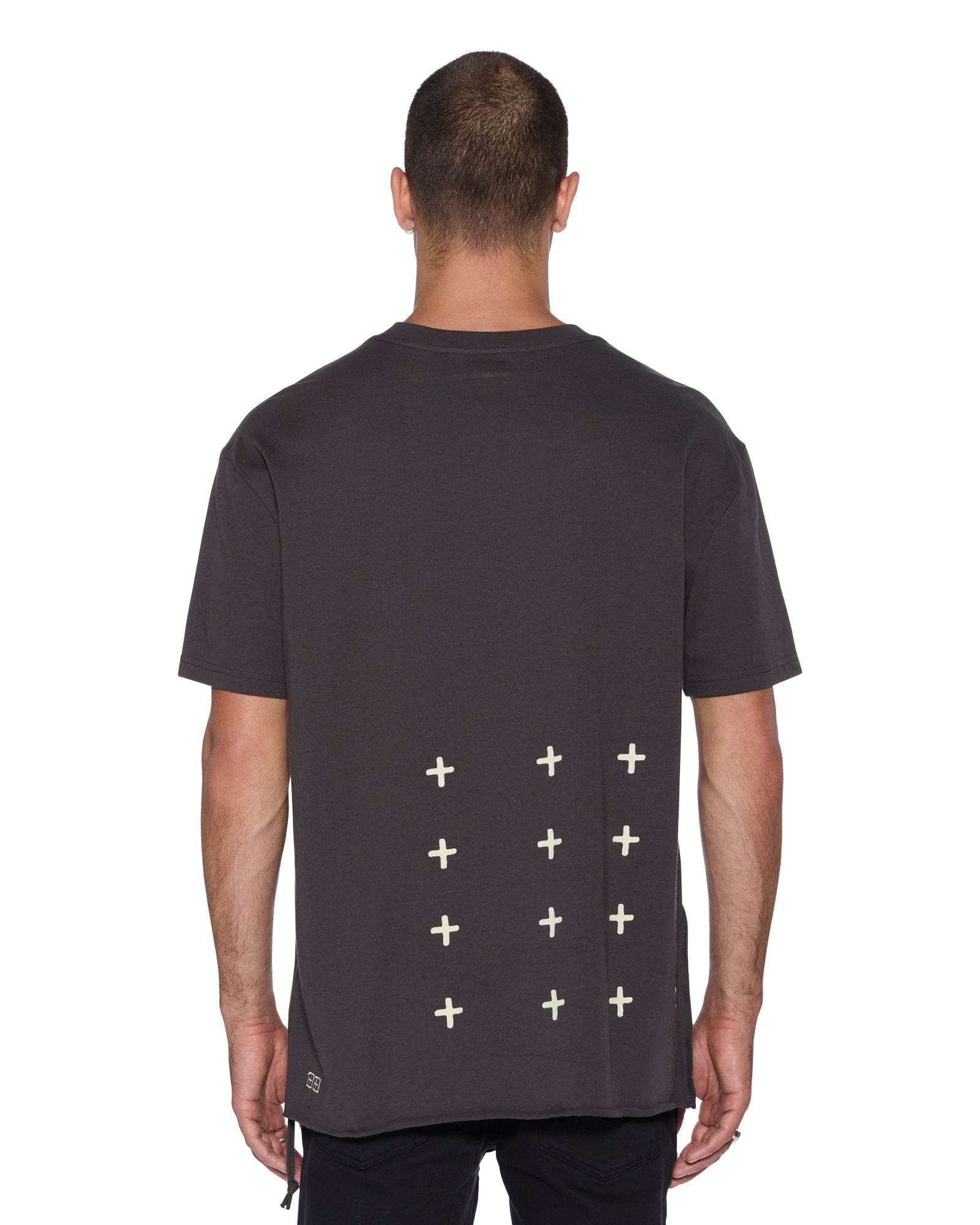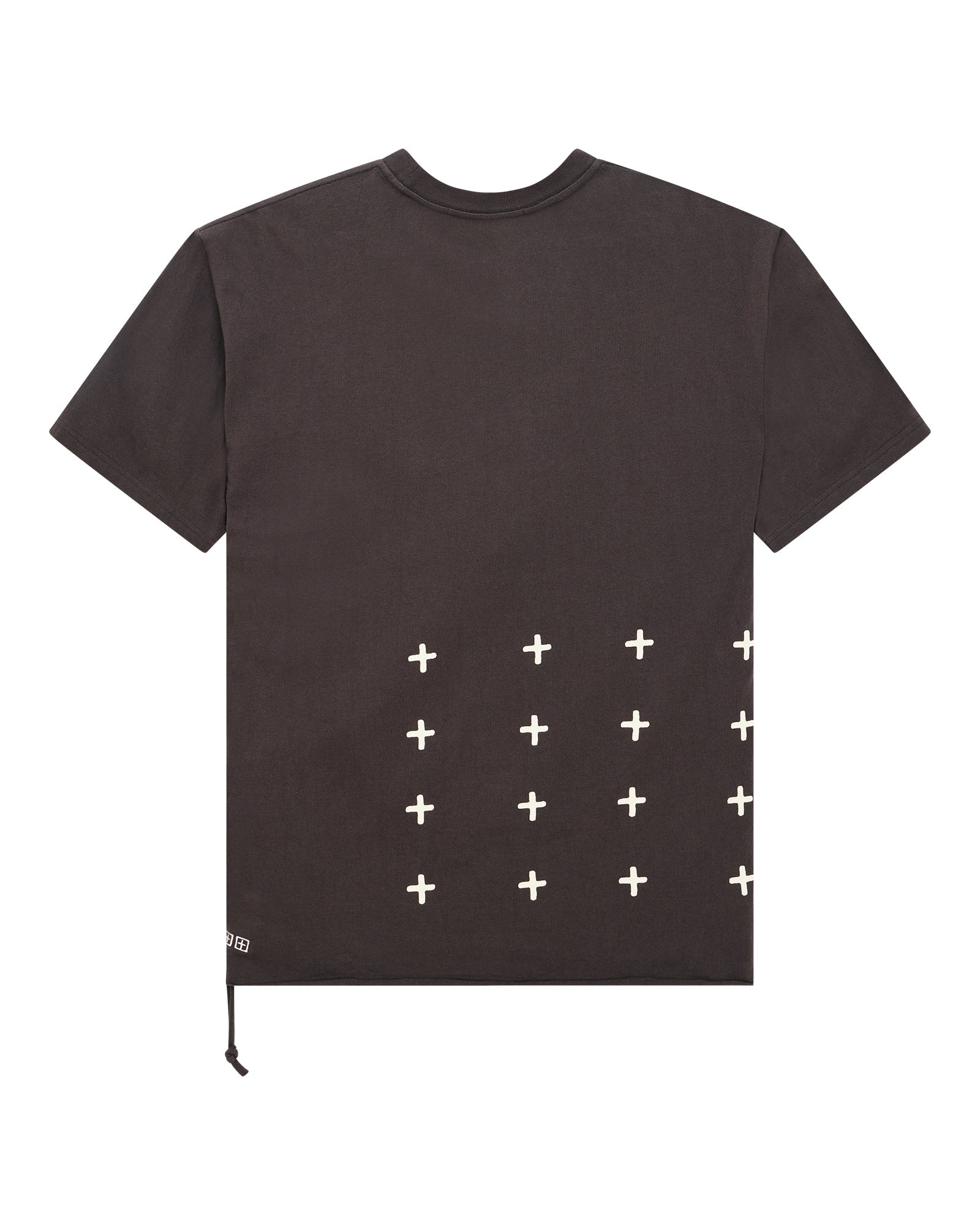 The Salud Biggie SS Tee Faded Black is an oversized fit short sleeve t-shirt with a raw-cut back hem, reverse overlocked side seams, and signature rats tail. Made from premium cotton jersey garment dyed in faded black, it features seasonal chainstitching art on the front, finished with signature T-box and 4x4 branding.