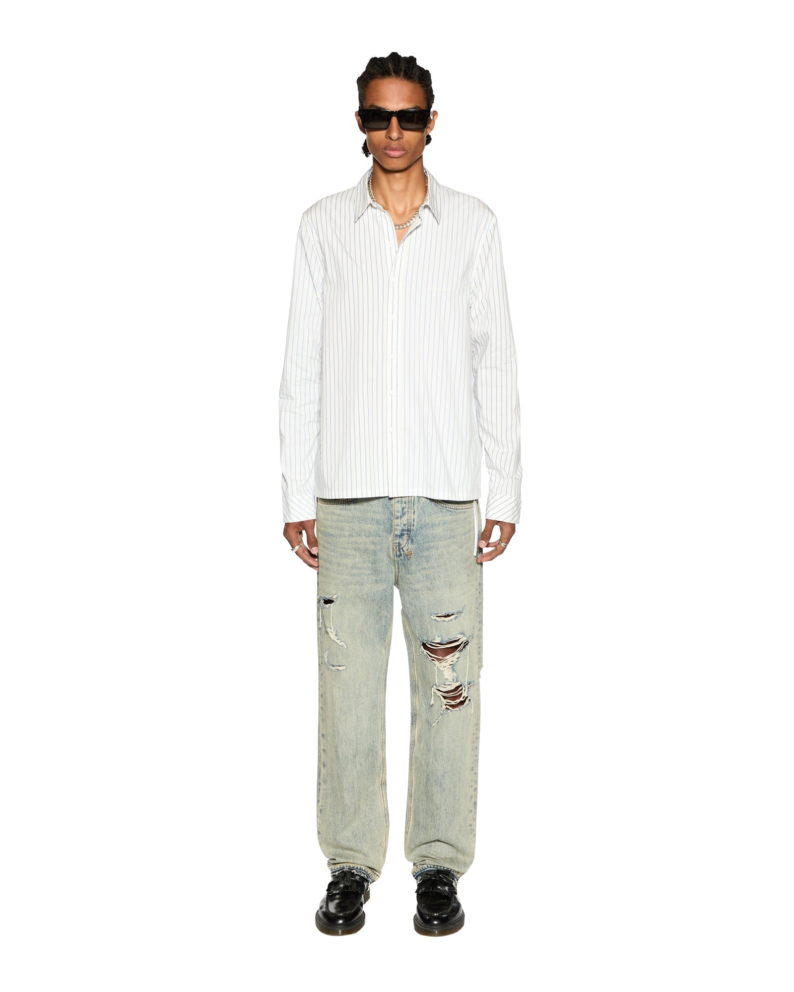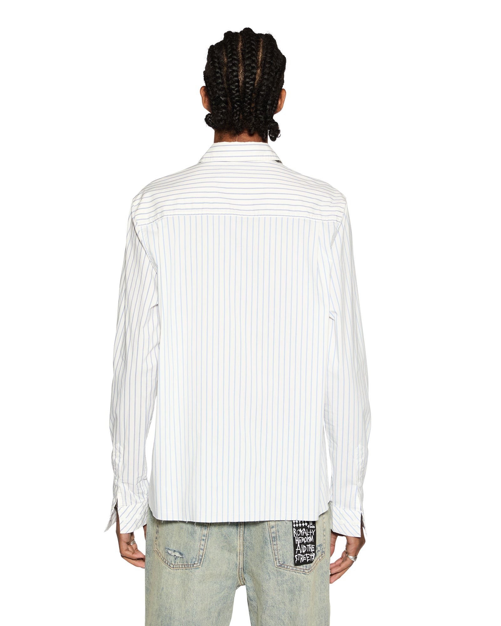 The Skript Long Sleeve Shirt 2 Stripe is a relaxed fit long sleeve button-down shirt made from classic pinstripe cotton poplins. It features traditional placket and sleeve closure, back yoke with twin pleats, a signature rats tail, contrast pinstripe fabric, seasonal embroidered artwork, and is finished with t-box embroidery and ksubi branded hardware.