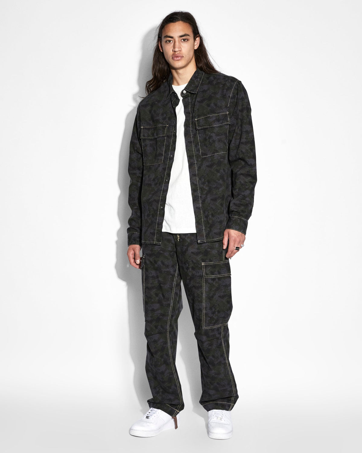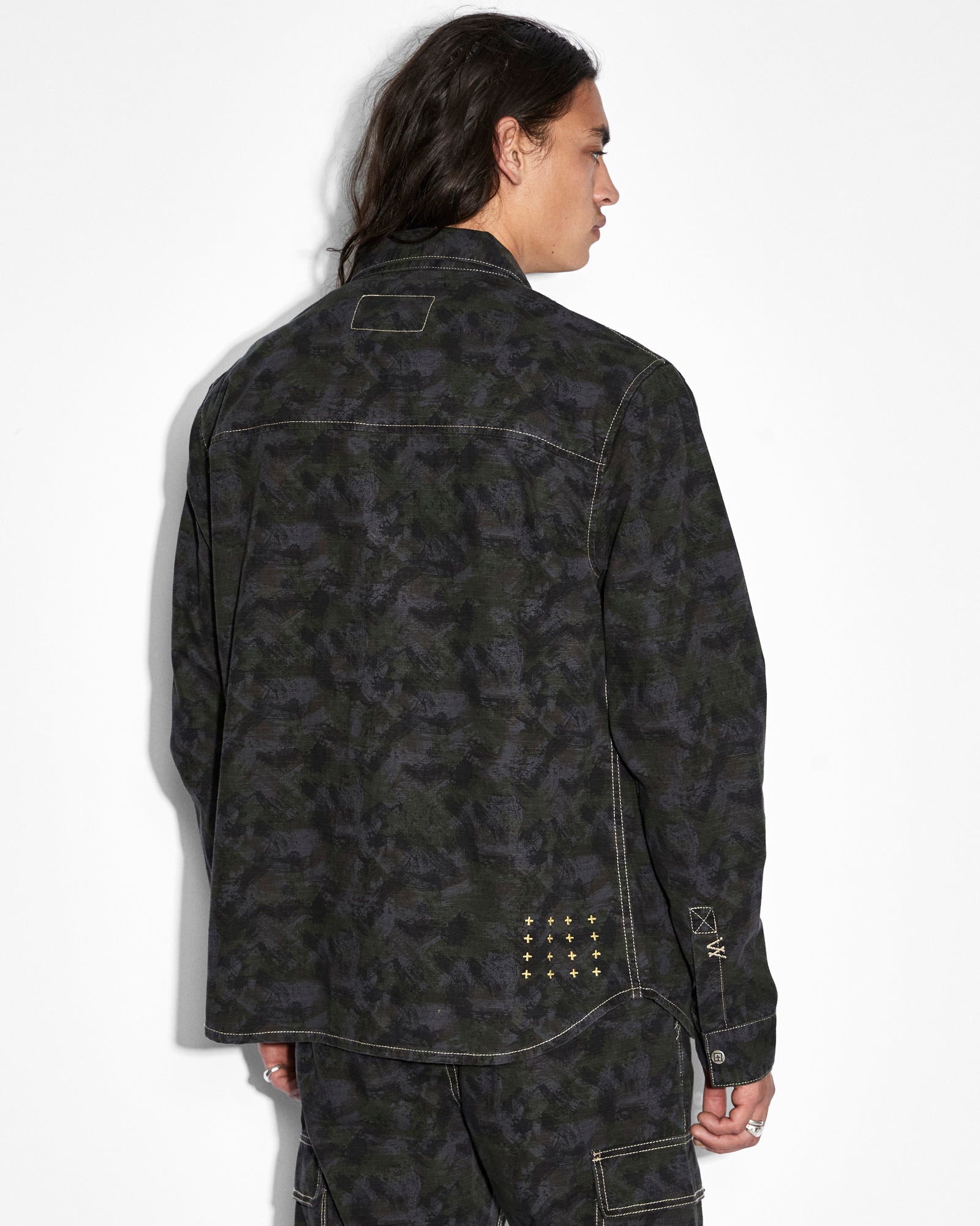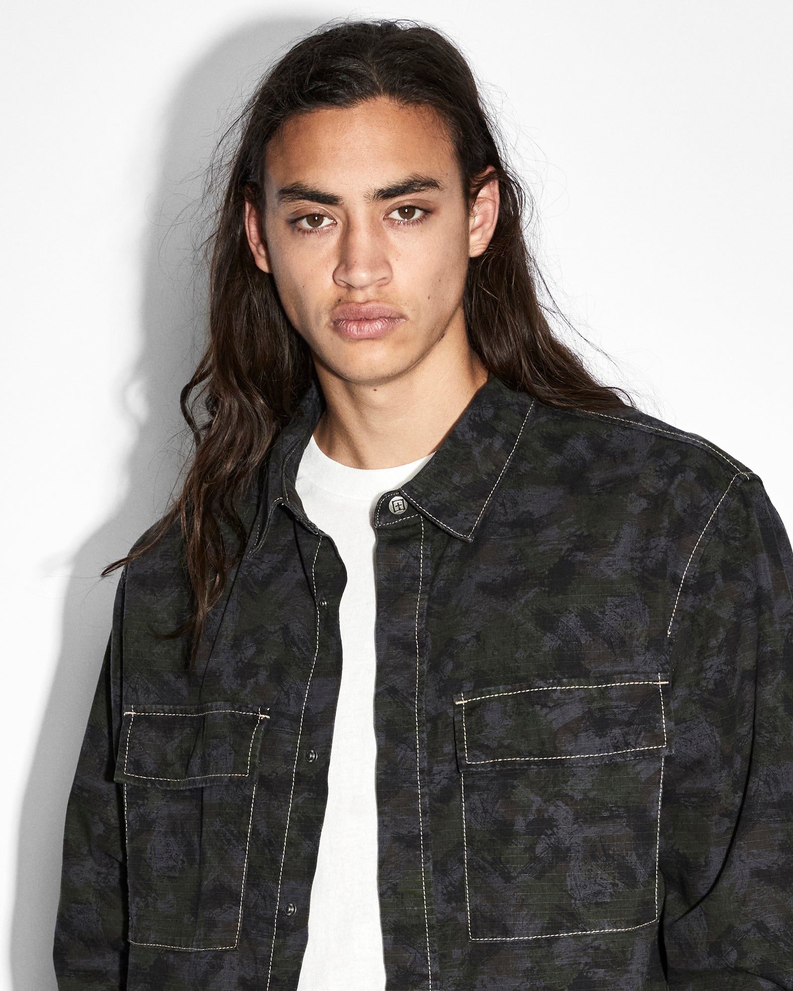 The Snakebite Ls Shirt Camo is designed as a button through long sleeve shirt with the iconic Ksubi t-box printed branding. This relaxed fit style is made from cotton ripstop fabric with a custom camouflage print and features front patch pockets and a curved hem. Wear with the 'Fugitive Cargo Pant Camo' for a full camo look.