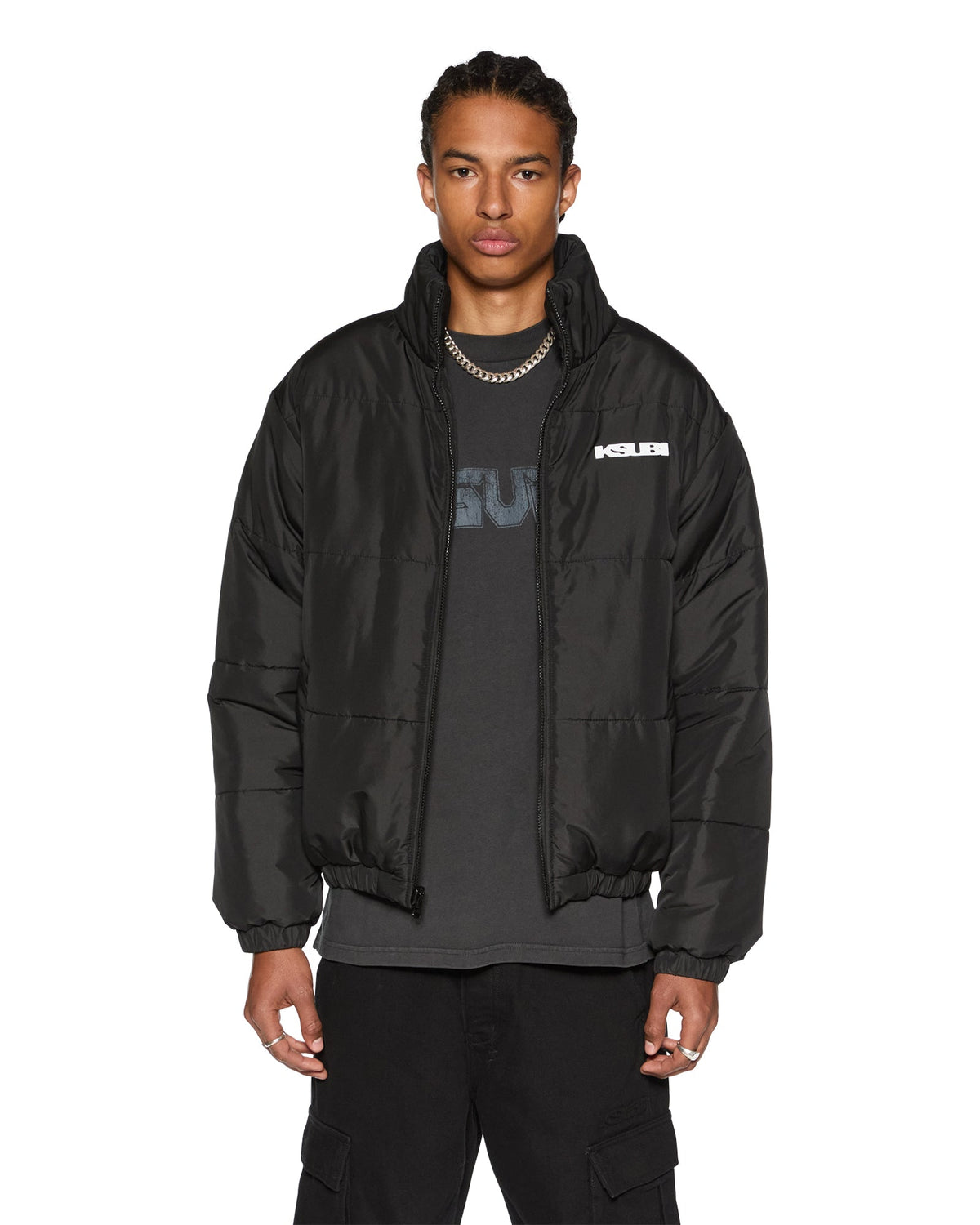 The Sott Puffer Jacket Black features a boxy fit with a zip-through front, zip-up pockets, wadded ribs, and elastic cuffed sleeves. Made from black European ripstop nylon with midweight internal wadding, it showcases a raised rubber Sign Of the Times logo on the back shoulder and front chest, finished with T-box and 4x4 branding in raised rubber.