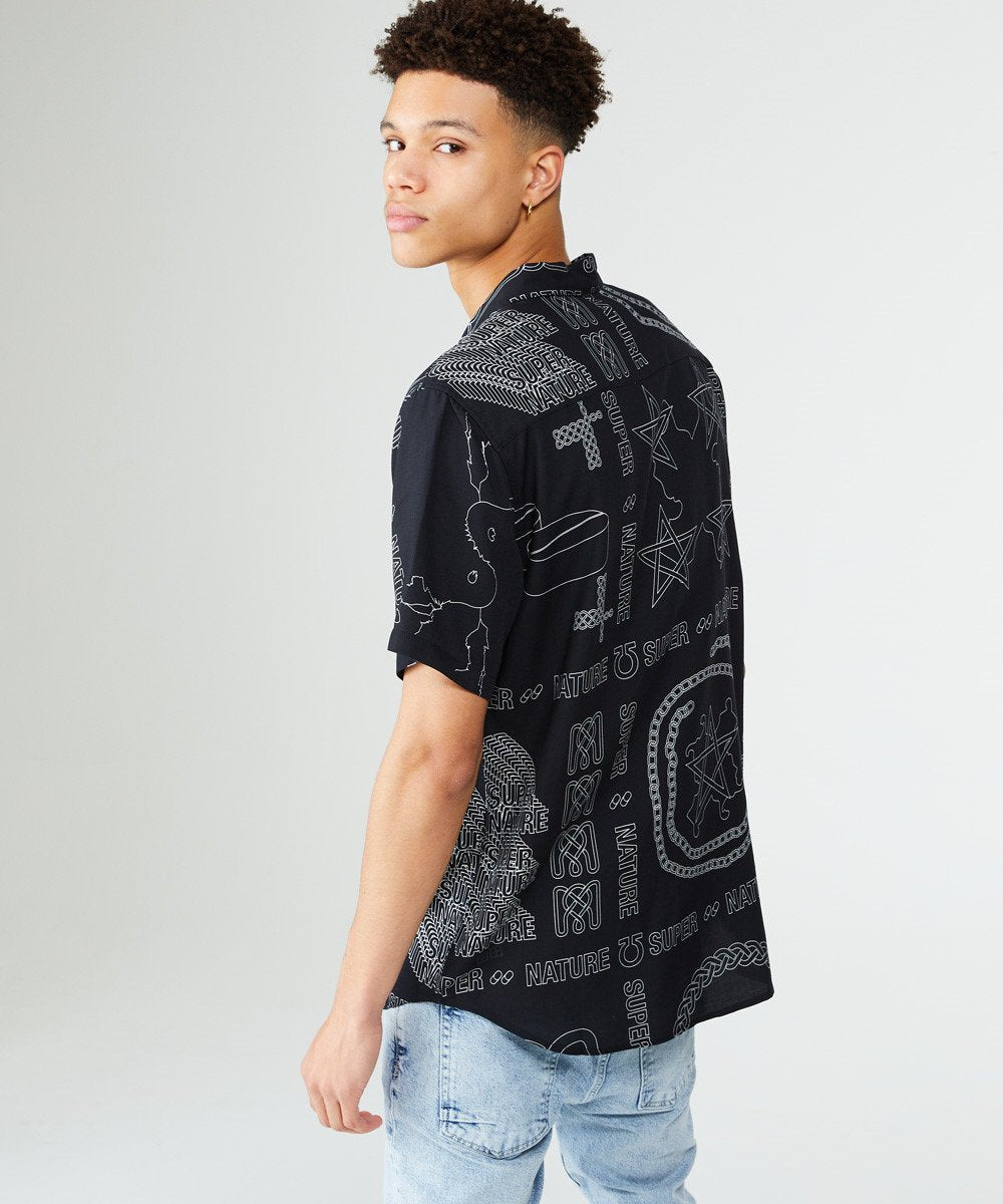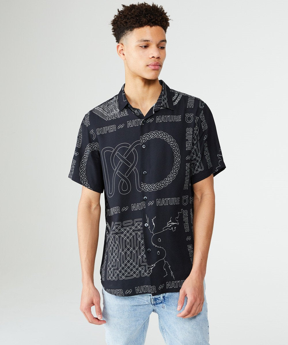 The Super Nature Short Sleeve Shirt is made of 100% rayon in a black colourway with contrasting super nature engineered print in grey. This style features a collared neckline, relaxed fit and signature T-box logo.