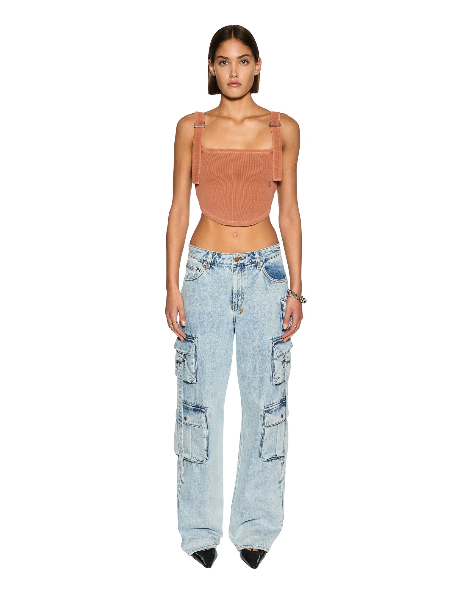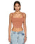 The Syndicate Buckle Tank Sunburn is a cropped tank top made from a premium ribbed stretch cotton in a orange tan colourway. Finished with a tonal Ksubi logo embroidered on the back neck, a cross dollar logo embroidered at the front and Ksubi x Patty Mills signature t-box embroidery on the side. This tank has chunky straps with buckles at the front and a curved shaped hemline.