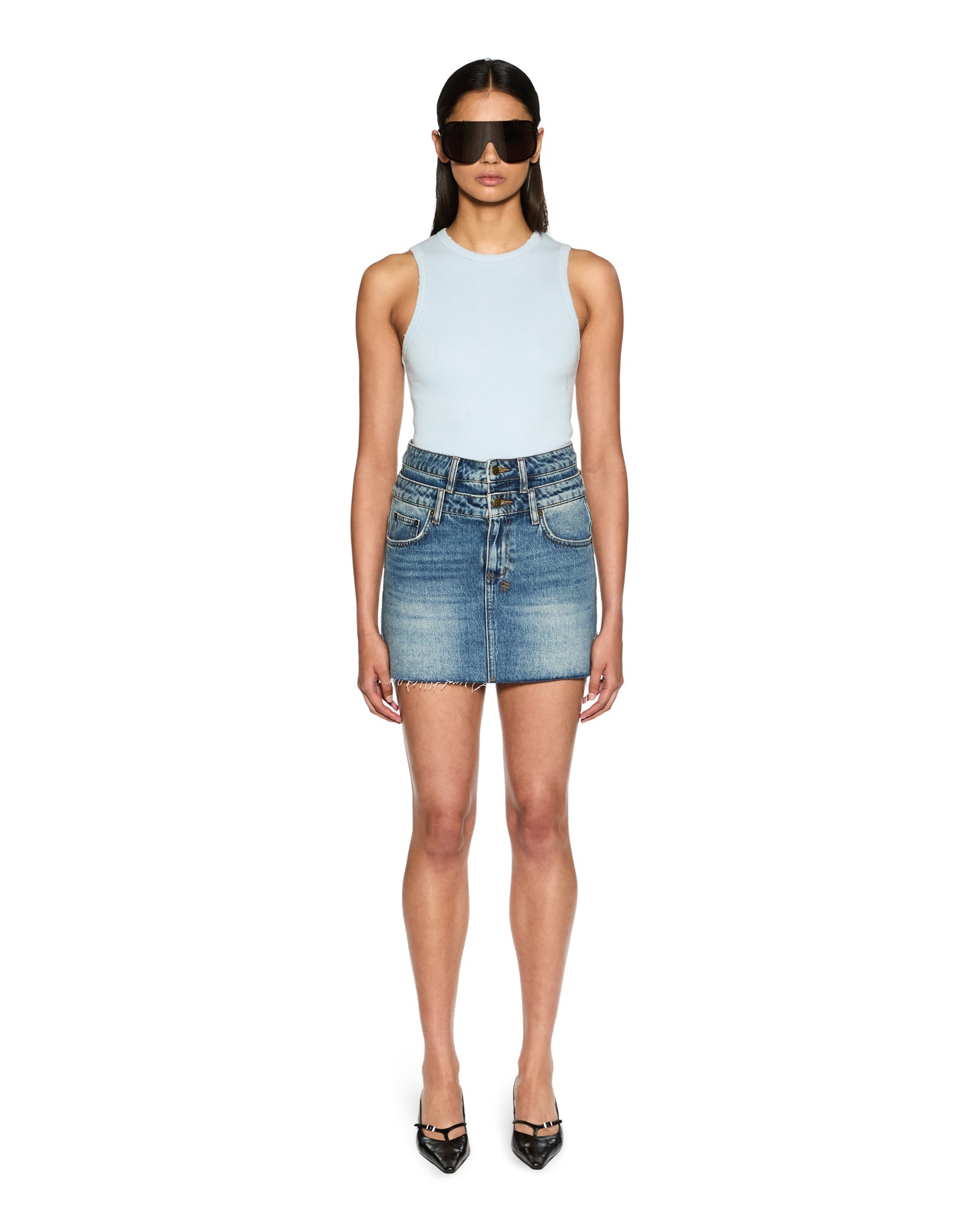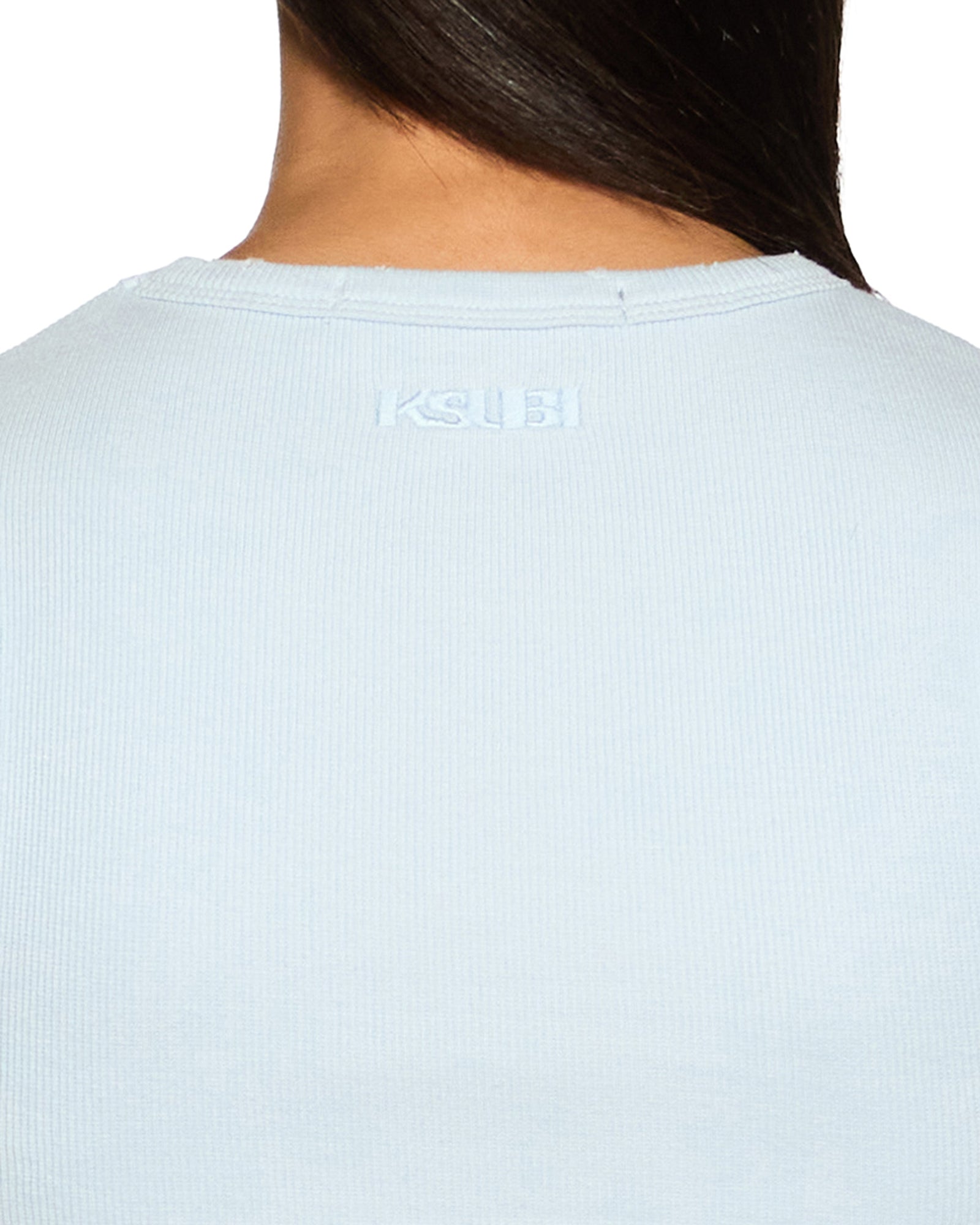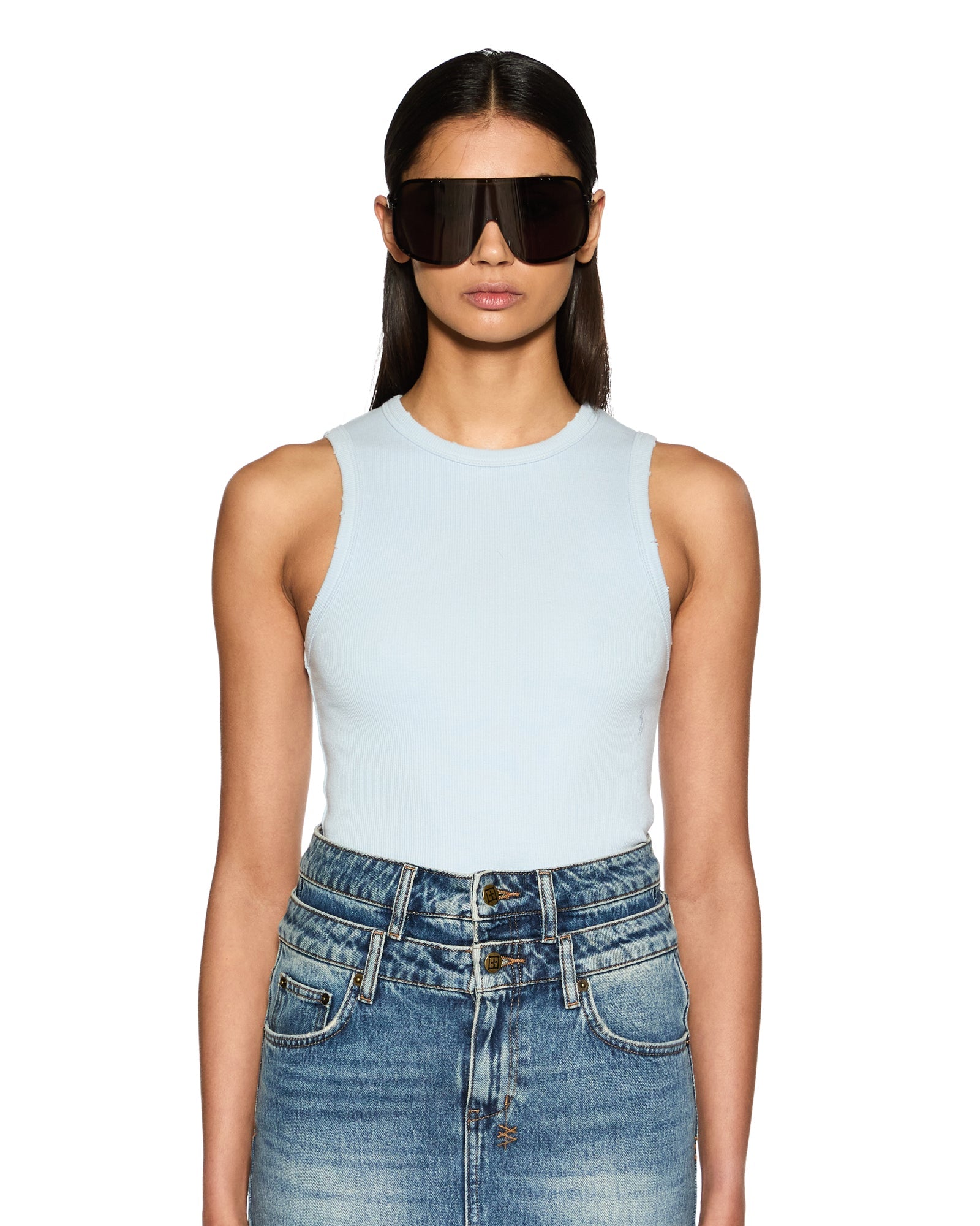 The Syndicate Tank Xtra Sky is a full-length tank with a round neck and racerback in the seasonal 'Sky' blue colorway, crafted from premium cotton blend rib for a supportive fit and premium hand feel. It features tonal 'Sign of The Times' logo embroidery at the back neck, cross dollar embroidery at the front, and T-box embroidery at the back hem, making it easy to pair with any bottoms.