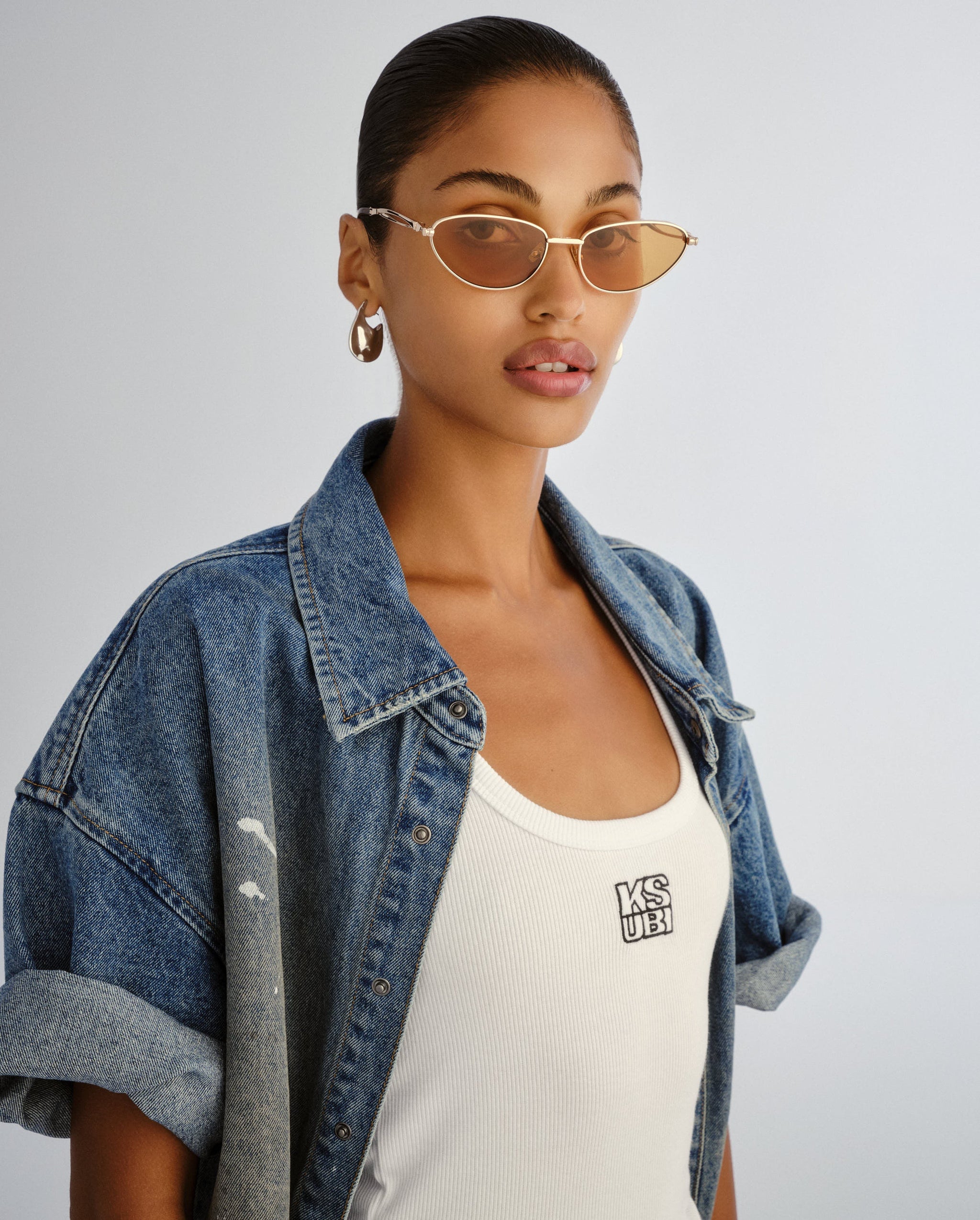 The Ripley Sunglasses Gold feature a sharp cat-eye silhouette with sculptural, sleek lines and attitude from every angle. Designed with Ksubi's signature skeletal temple hardware for a bold, standout finish, they are delivered in signature Ksubi eyewear packaging with a branded cleaning cloth.