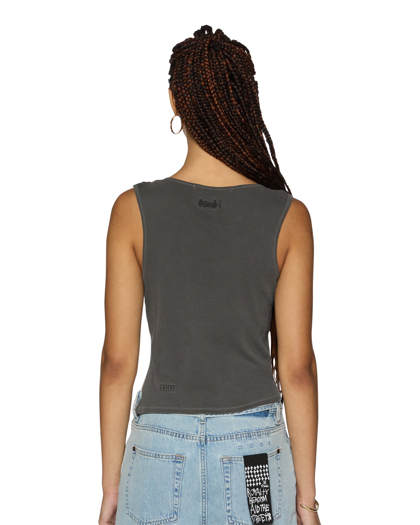 The Twisted Tank Charcoal is a full-length tank made from premium lightweight cotton rib in charcoal. It features a unique twisted detail on one shoulder, with a raw cut neckline and side seam split. Branding includes cross dollar and T-box embroidery.
