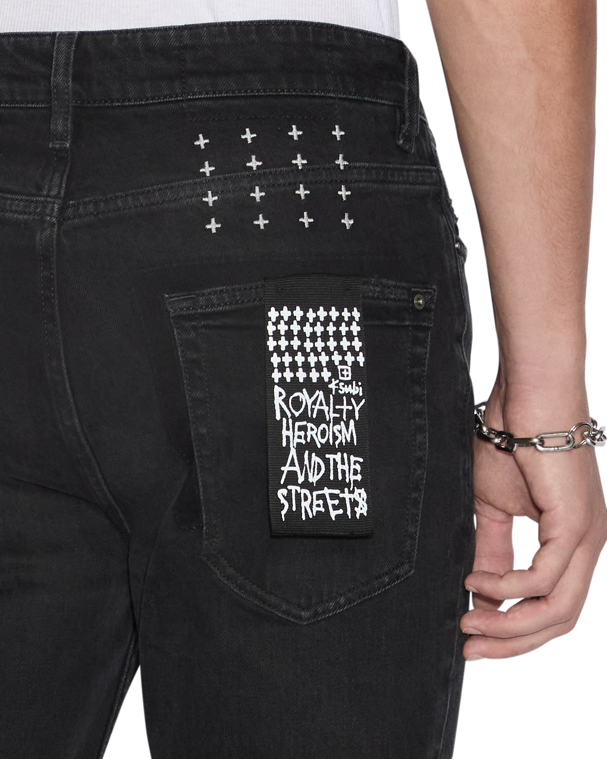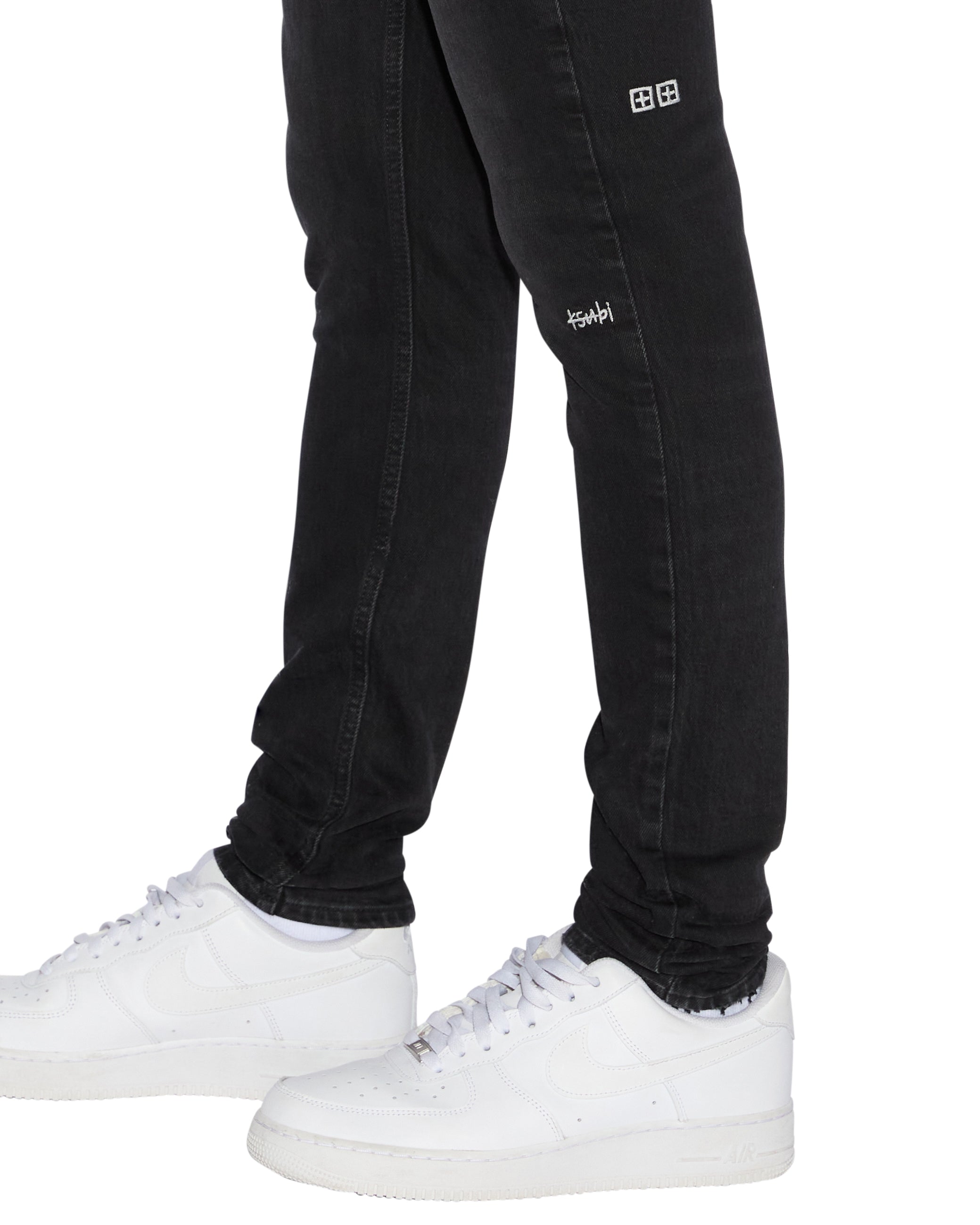The Van Winkle Artist Black is a skinny leg jean made from a comfort stretch, vintage washed black denim. The legs are detailed with bleach splattering, a white Ksubi logo on the left knee and the classic t-box embroidery. The back pocket has been removed and misplaced to mimic a repair job in addition to seam grinding to create an aged look.