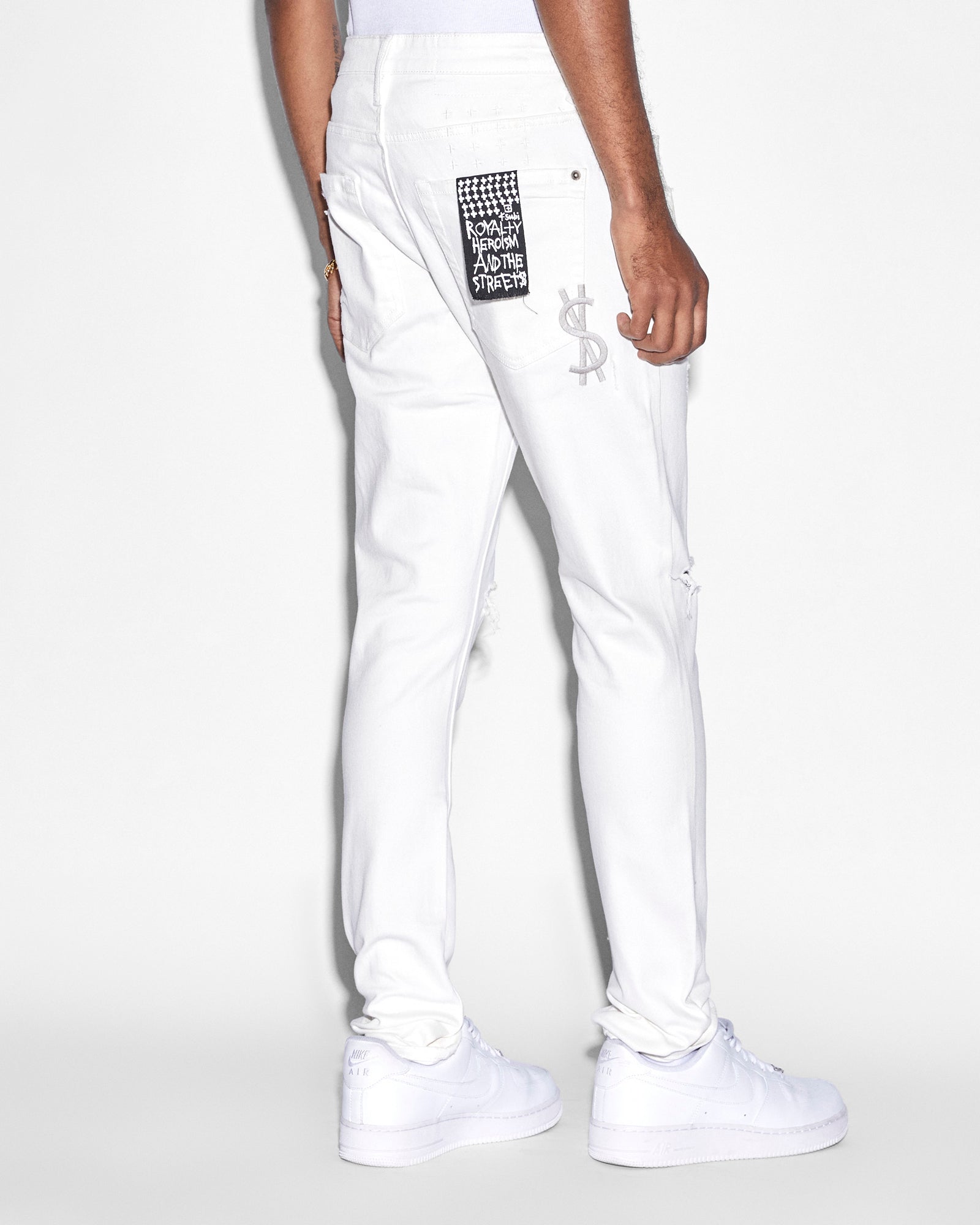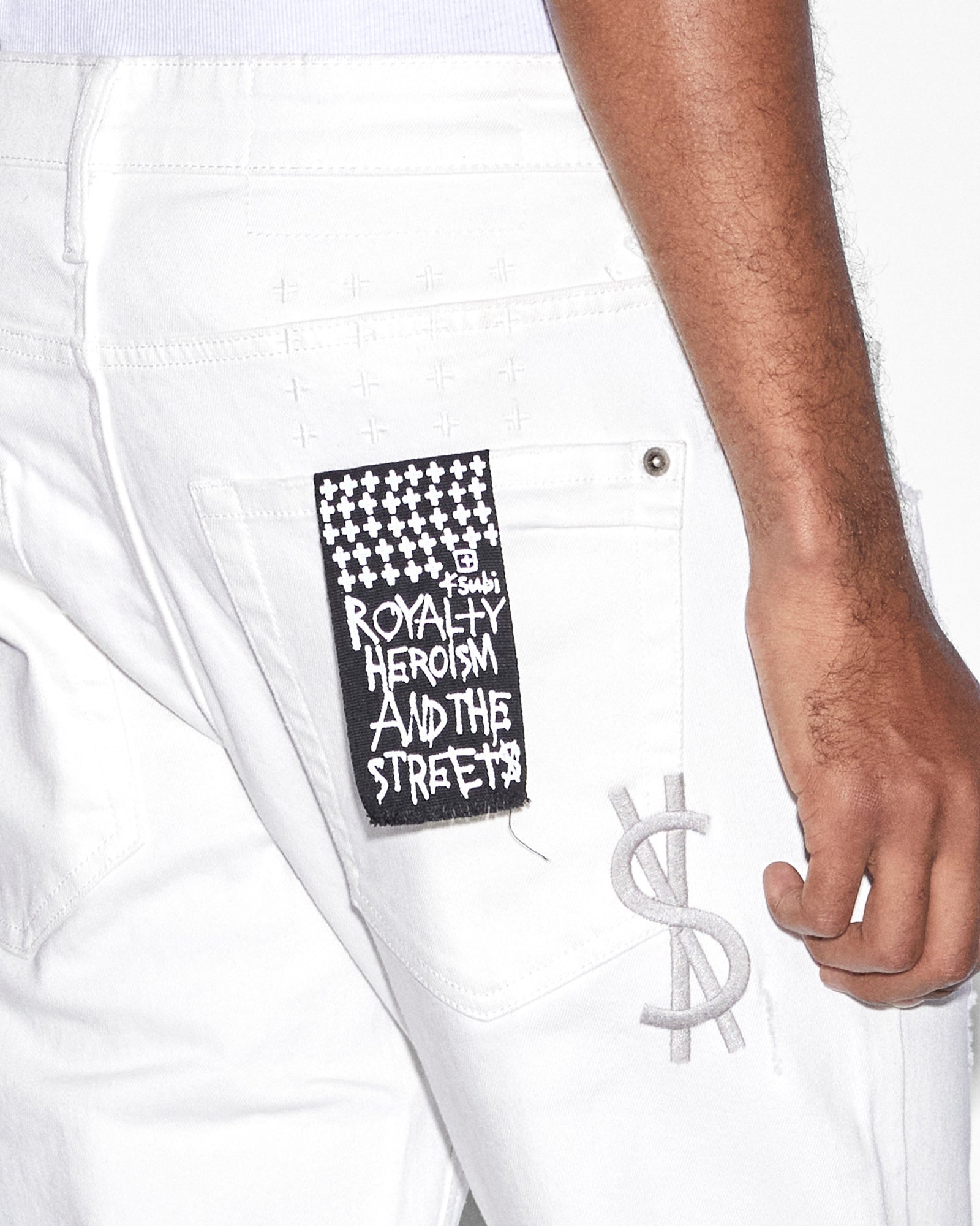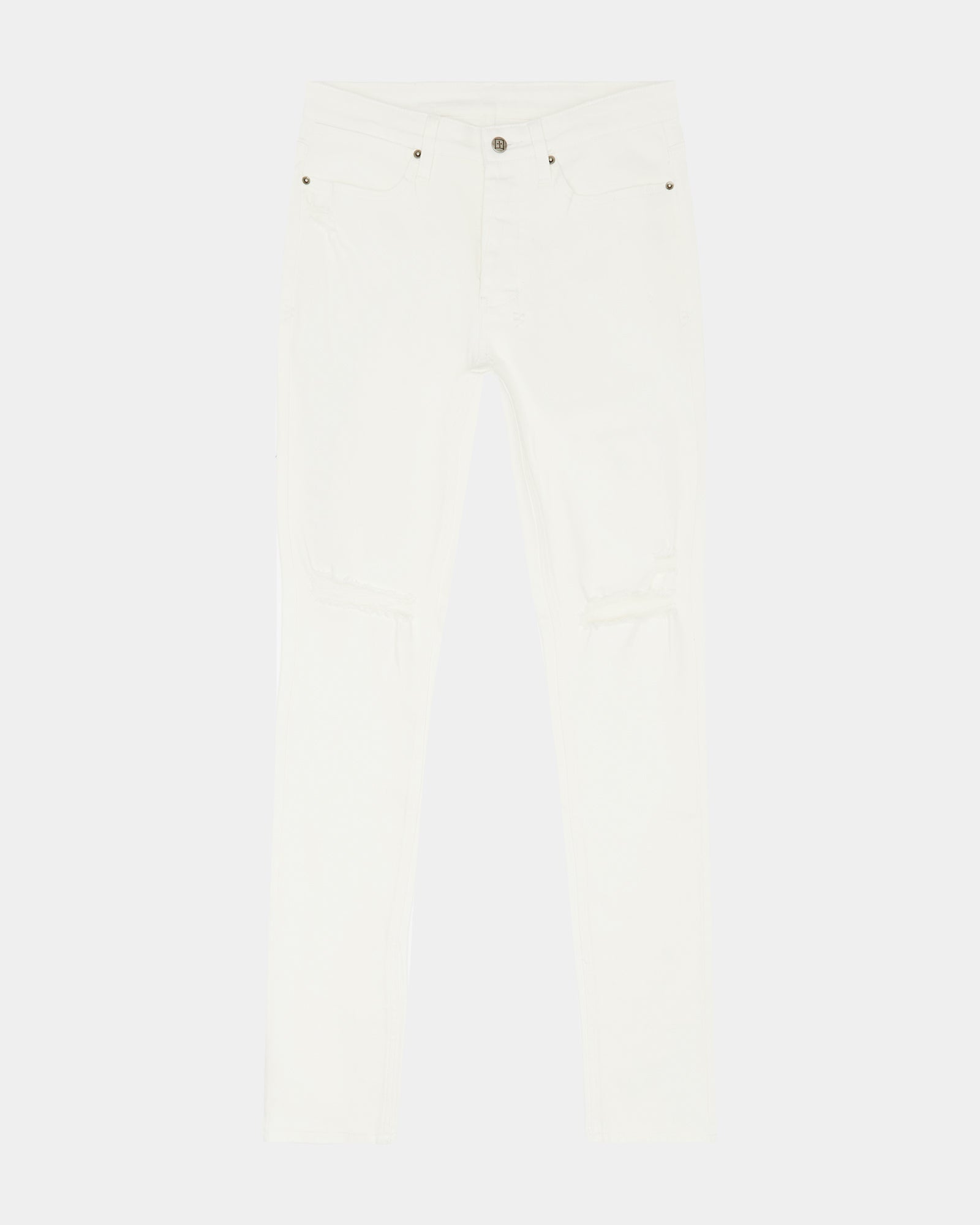 The Van Winkle Avalanche Trashed is a full-length skinny jean with a mid-rise fit and five pocket detailing. Crafted from premium white comfort stretch denim, this jean showcases angled belt loops and front fly seam detailing. Rip and repair elements featuring embroidery artwork. This style has the unique t-box and 4x4 embroidery and Ksubi branded hardware.