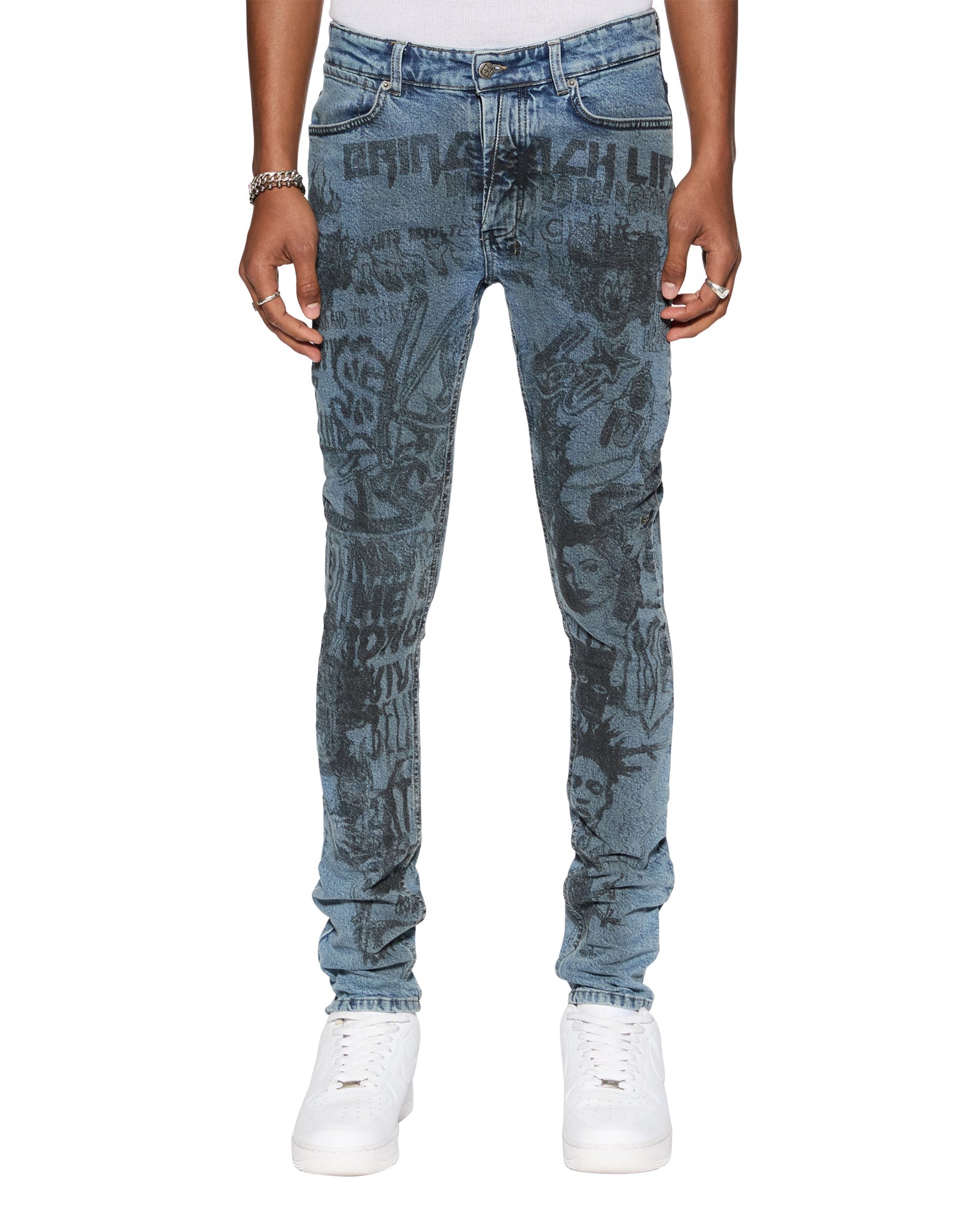The Van Winkle Champagne Sketch is a mid-rise, full-length skinny jean with classic five-pocket styling. Made from European comfort stretch denim, featuring unique angled belt loops, repaired rips with seasonal artwork printed on repair fabric. Finished with T-box and 4x4 embroidery, ghost patch detailing, and Ksubi branded hardware.