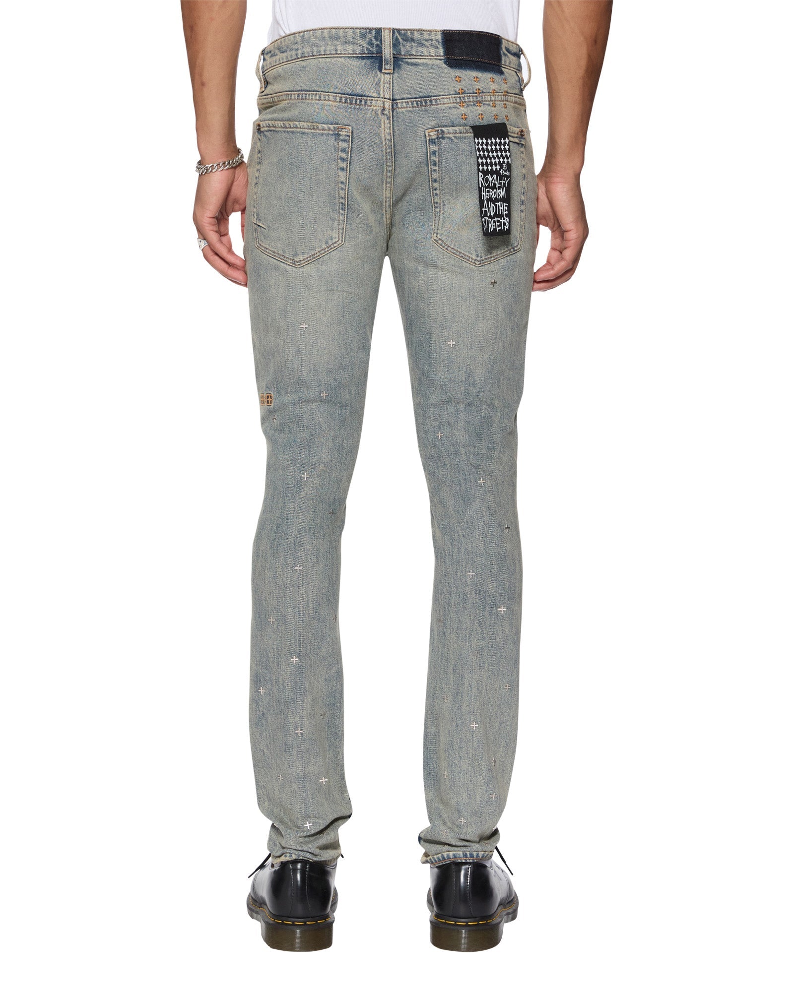 The Van Winkle Stagelight Metalik is a mid-rise five-pocket full-length skinny jean. Made from premium comfort stretch indigo denim with a vintage tinted stone wash. Constructed with unique angled belt loops, front fly seam detail, and aging treatment. Features metal plus hotfixes applied on the front and back of the garment, with a heavier quantity concentrating at the hem and grading away towards the waist. Finished with T-box and 4x4 embroidery, ghost patching detailing, and Ksubi branded hardware.